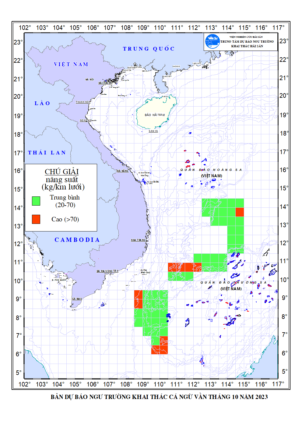 Trang nhất/ Dự báo khai thác theo đối tượng Dự báo ngư trường cá ngừ vằn tháng 10/2023 Mùa vụ: Vụ Bắc () | Năm dự báo: 2023 | Tháng dự báo: 10/2023 Đối tượng dự báo: Cá ngừ vằn Cơ quan dự báo: Trung tâm Dự báo ngư trường Khai thác hải sản