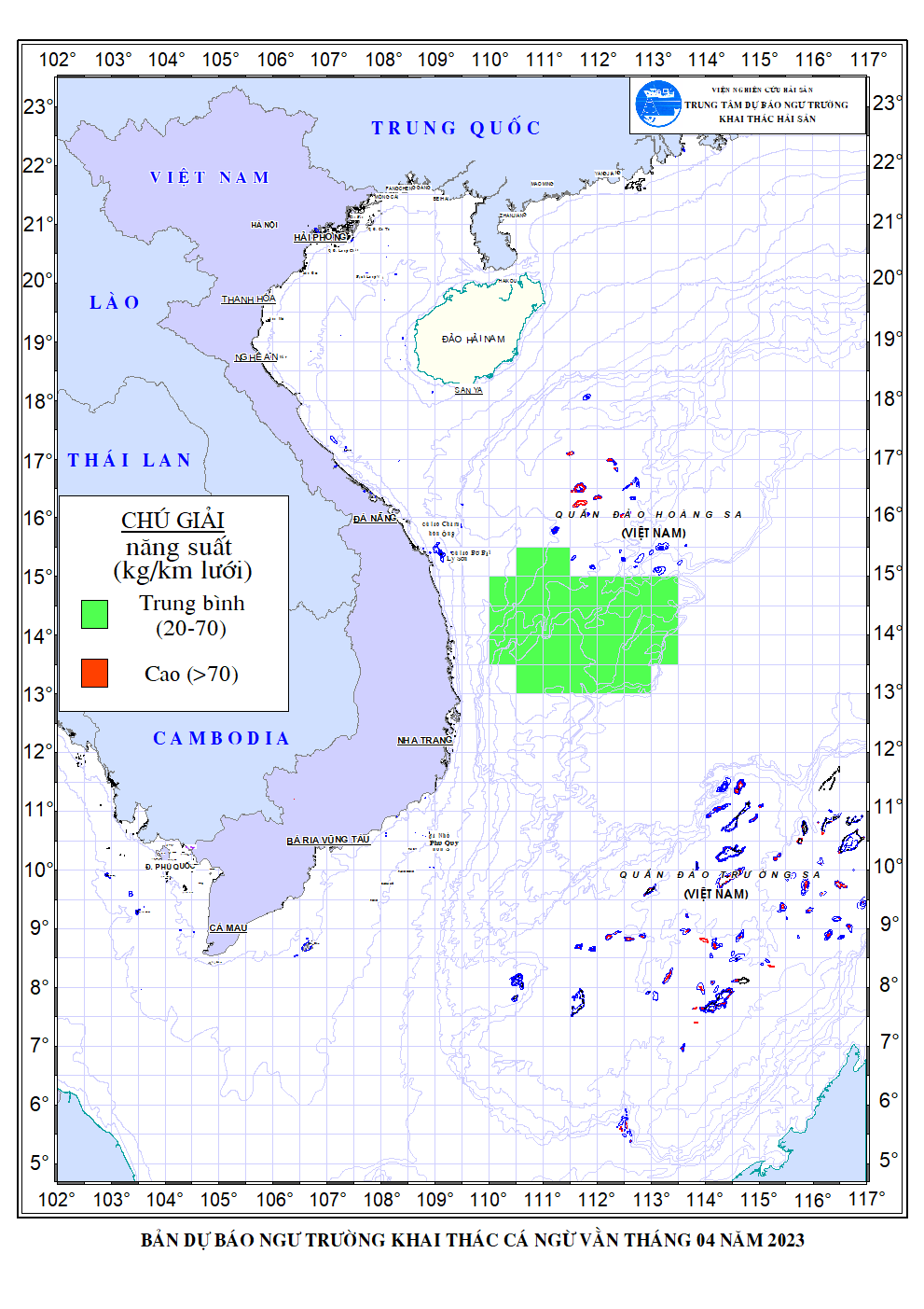 Trang nhất/ Dự báo khai thác theo đối tượng Dự báo ngư trường cá ngừ vằn tháng 4/2023 Mùa vụ: Vụ Nam () | Năm dự báo: 2023 | Tháng dự báo: 04/2023 Đối tượng dự báo: Cá ngừ vằn Cơ quan dự báo: Trung tâm Dự báo ngư trường Khai thác hải sản