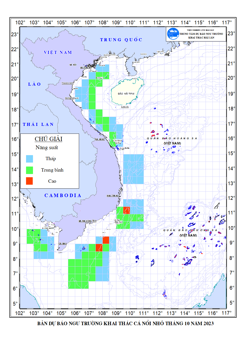 Trang nhất/ Dự báo khai thác theo đối tượng Dự báo ngư trường cá nổi nhỏ tháng 10/2023 Mùa vụ: Vụ Bắc () | Năm dự báo: 2023 | Tháng dự báo: 10/2023 Đối tượng dự báo: Cá nổi nhỏ Cơ quan dự báo: Trung tâm Dự báo ngư trường Khai thác hải sản