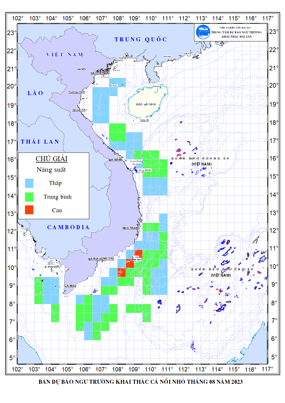 Trang nhất/ Dự báo khai thác theo đối tượng Dự báo ngư trường cá nổi nhỏ tháng 8/2023 Mùa vụ: Vụ Nam () | Năm dự báo: 2023 | Tháng dự báo: 08/2023 Đối tượng dự báo: Cá nổi nhỏ Cơ quan dự báo: Trung tâm Dự báo ngư trường Khai thác hải sản