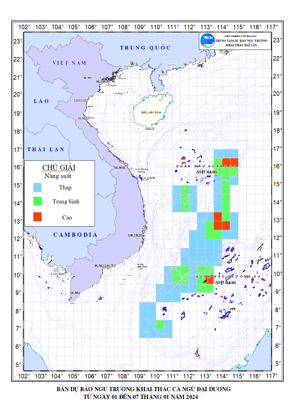 Trang nhất/ Dự báo khai thác theo nghề Dự báo ngư trường câu cá ngừ đại dương từ 01-07/01/2024 Mùa vụ: Vụ Bắc () | Năm dự báo: 2024 | Tháng dự báo: 01/2024 Nghề: Câu cá ngừ đại dương Cơ quan dự báo: Trung tâm Dự báo ngư trường Khai thác hải sản