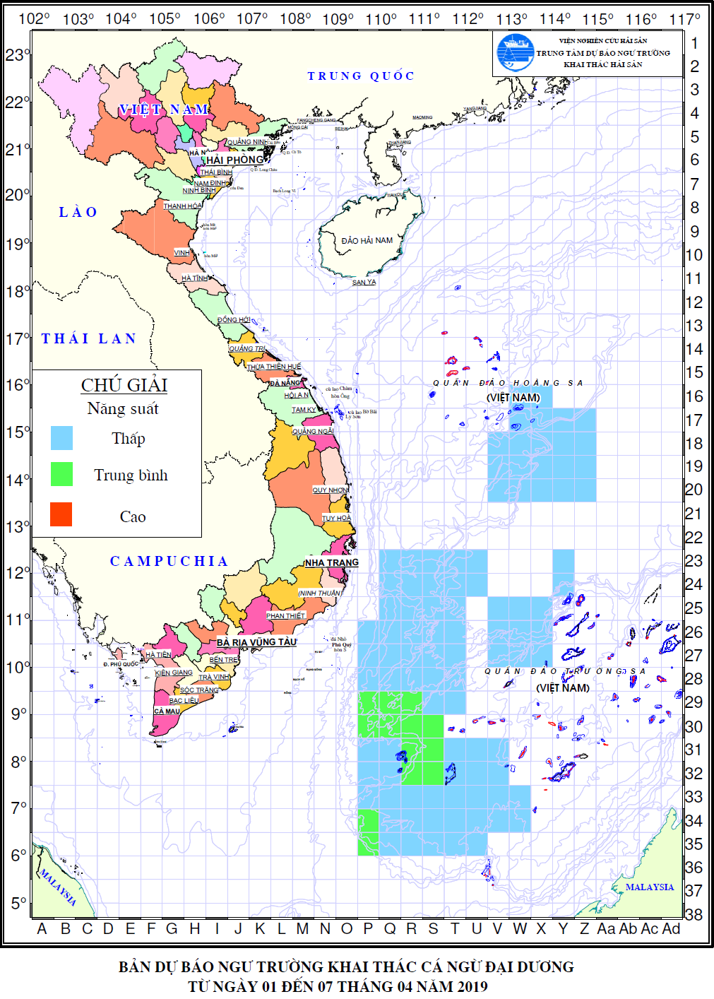 Dự báo ngư trường khai thác cá ngừ đại dương (Hạn 07 ngày, từ 01/04/2019 đến 07/04/2019)