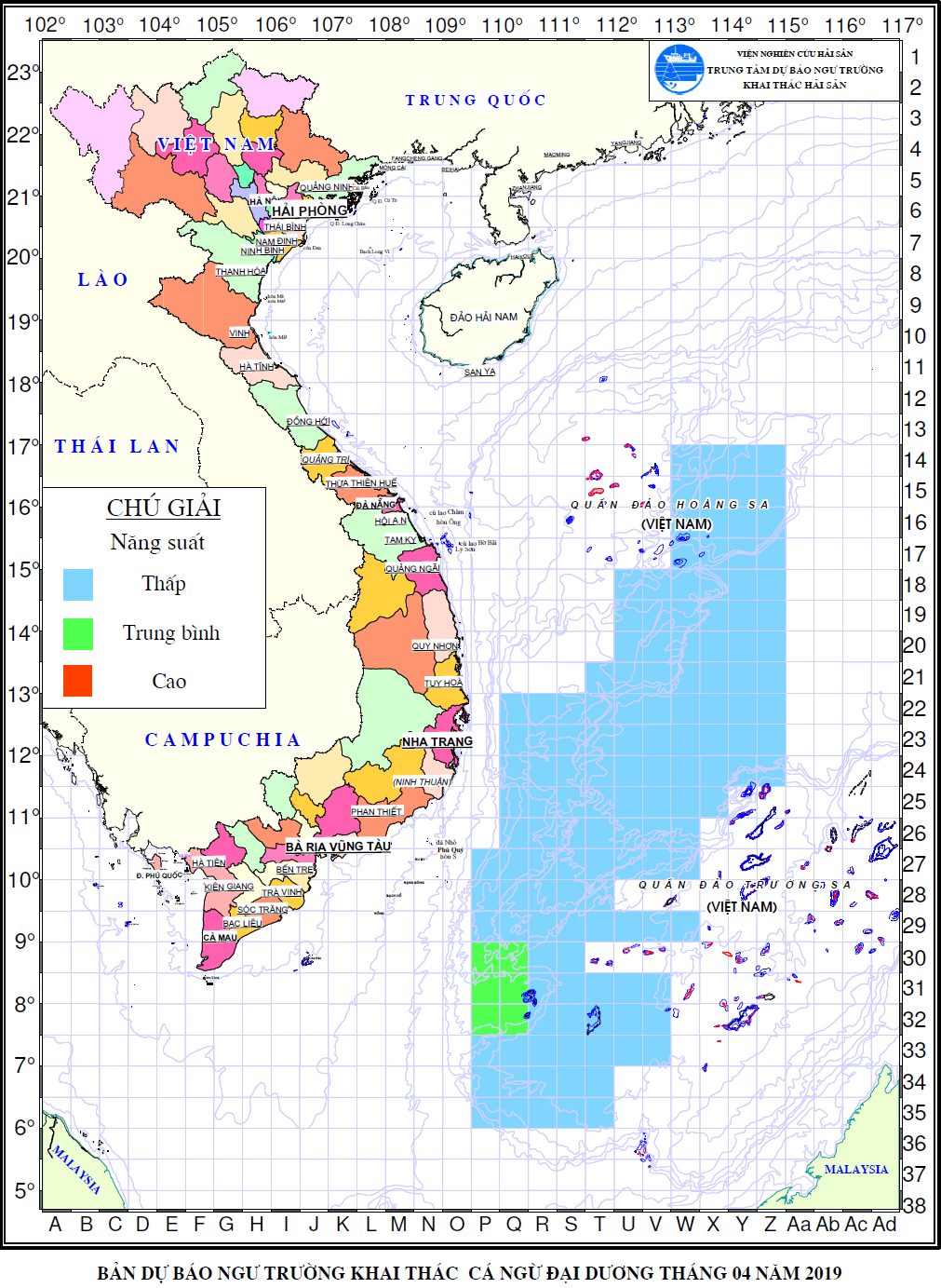 Trang nhất/ Dự báo khai thác theo đối tượng Dự báo ngư trường khai thác cá ngừ đại dương (Hạn tháng, tháng 04/2019) Mùa vụ: Vụ Nam () | Năm dự báo: 2019 | Tháng dự báo: 04/2019 Đối tượng dự báo: Cá ngừ đại dương Cơ quan dự báo: Trung tâm Dự báo ngư trường Khai thác hải sản