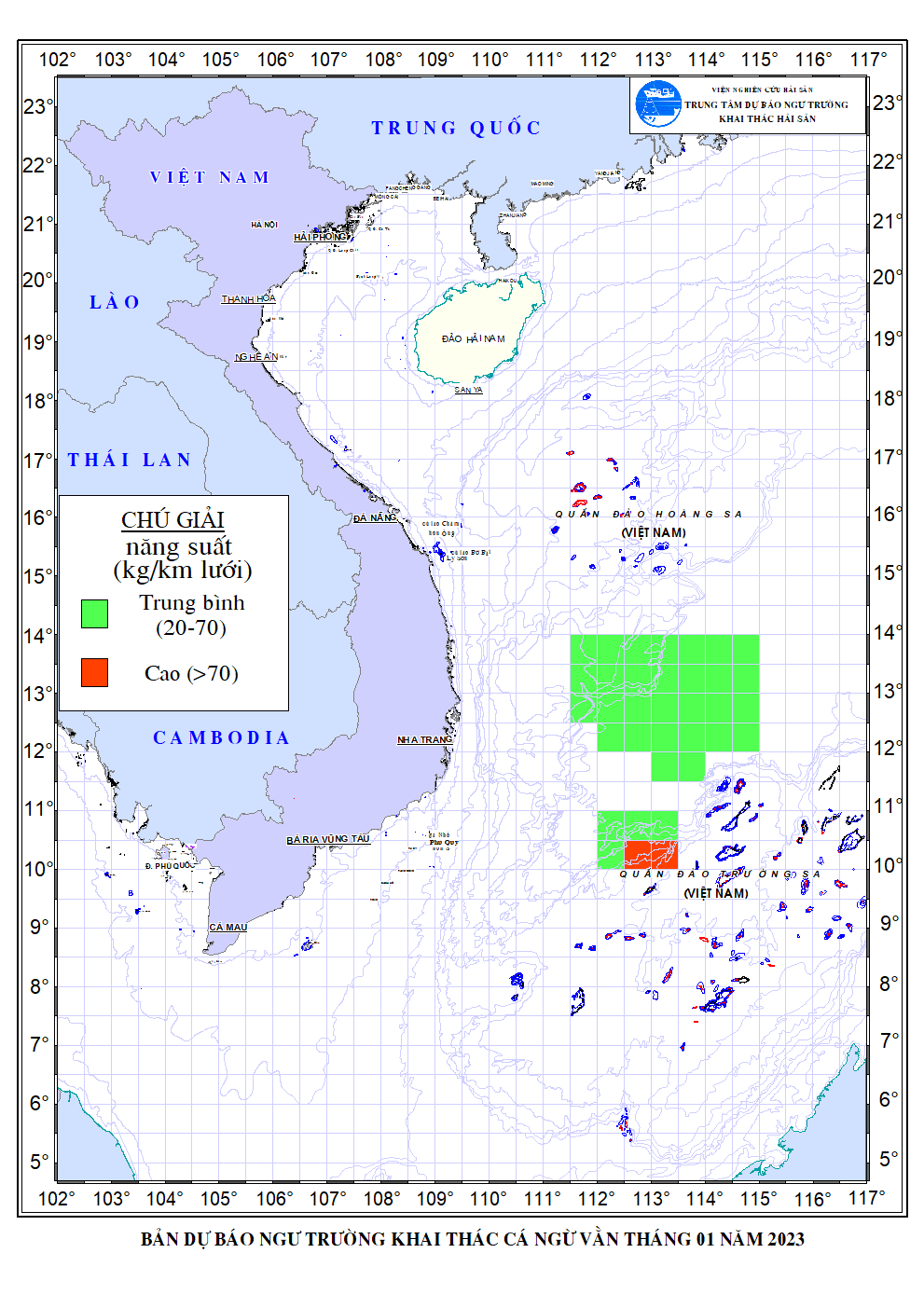 Trang nhất/ Dự báo khai thác theo đối tượng Dự báo ngư trường khai thác cá ngừ vằn tháng 01/2023 Mùa vụ: Vụ Bắc () | Năm dự báo: 2023 | Tháng dự báo: 01/2023 Đối tượng dự báo: Cá ngừ vằn Cơ quan dự báo: Trung tâm Dự báo ngư trường Khai thác hải sản