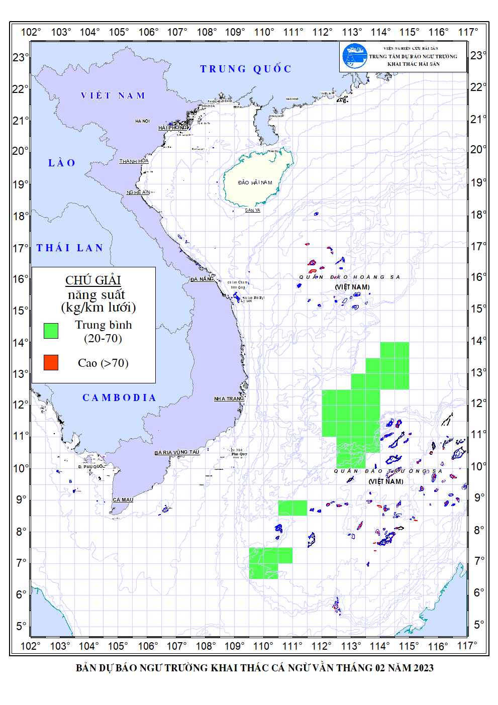 Trang nhất/ Dự báo khai thác theo đối tượng Dự báo ngư trường khai thác cá ngừ vằn tháng 02/2023 Mùa vụ: Vụ Bắc () | Năm dự báo: 2023 | Tháng dự báo: 02/2023 Đối tượng dự báo: Cá ngừ vằn Cơ quan dự báo: Trung tâm Dự báo ngư trường Khai thác hải sản