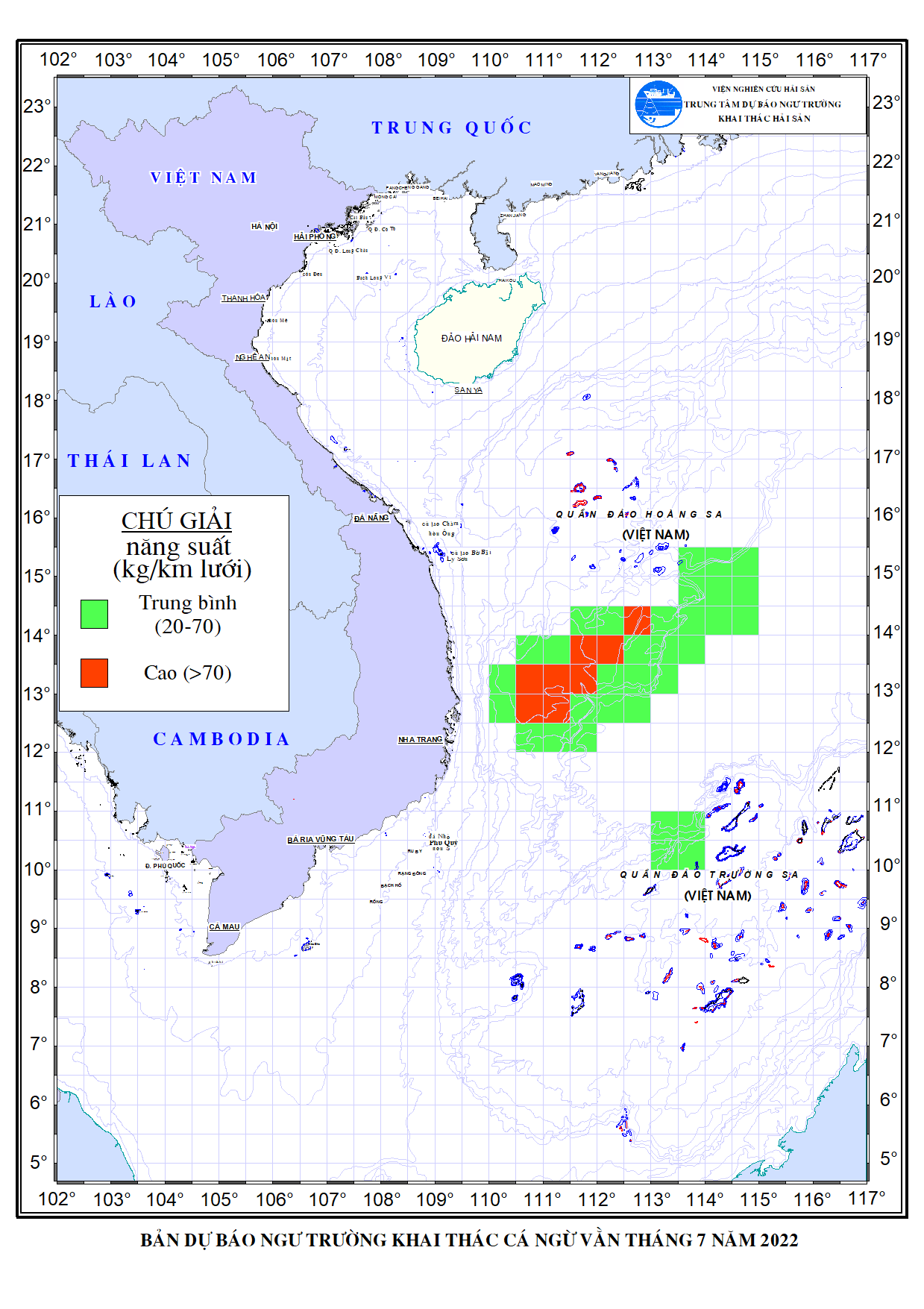 Trang nhất/ Dự báo khai thác theo đối tượng Dự báo ngư trường khai thác cá ngừ vằn tháng 7/2022 Mùa vụ: Vụ Nam () | Năm dự báo: 2022 | Tháng dự báo: 07/2022 Đối tượng dự báo: Cá ngừ vằn Cơ quan dự báo: Trung tâm Dự báo ngư trường Khai thác hải sản