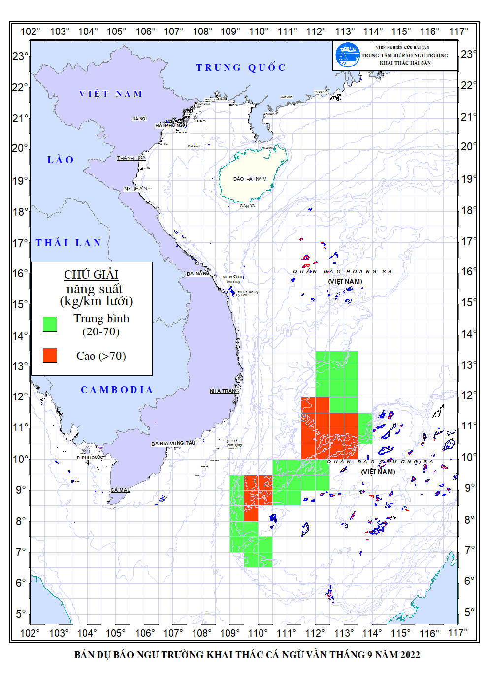 Trang nhất/ Dự báo khai thác theo đối tượng Dự báo ngư trường khai thác cá ngừ vằn tháng 9/2022 Mùa vụ: Vụ Nam () | Năm dự báo: 2022 | Tháng dự báo: 09/2022 Đối tượng dự báo: Cá ngừ vằn Cơ quan dự báo: Trung tâm Dự báo ngư trường Khai thác hải sản