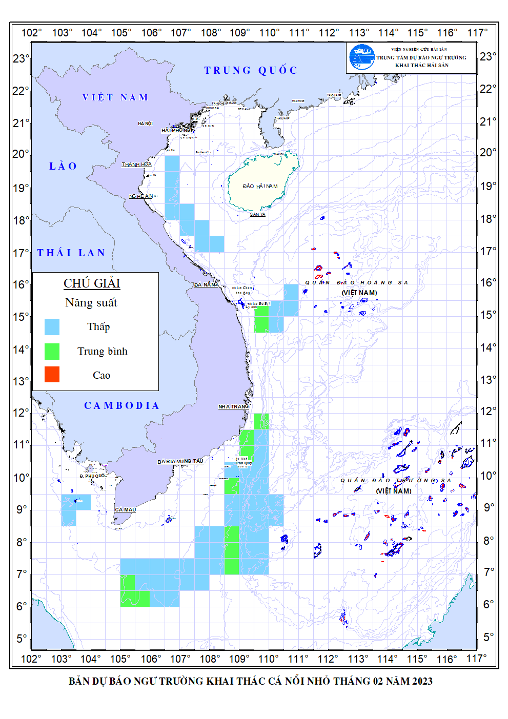 Trang nhất/ Dự báo khai thác theo đối tượng Dự báo ngư trường khai thác cá nổi nhỏ tháng 02/2023 Mùa vụ: Vụ Bắc () | Năm dự báo: 2023 | Tháng dự báo: 02/2023 Đối tượng dự báo: Cá nổi nhỏ Cơ quan dự báo: Trung tâm Dự báo ngư trường Khai thác hải sản