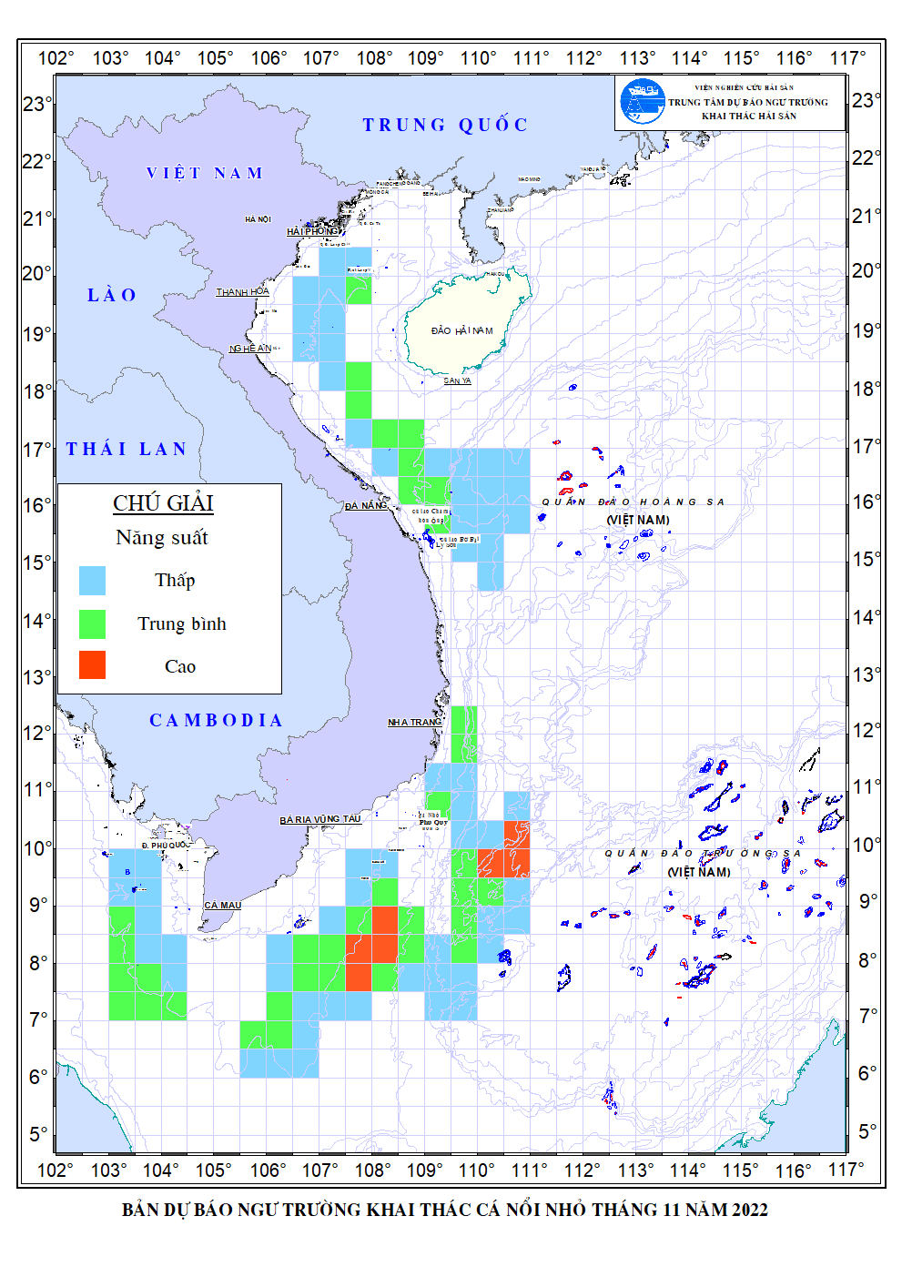 Trang nhất/ Dự báo khai thác theo đối tượng Dự báo ngư trường khai thác cá nổi nhỏ tháng 11/2022 Mùa vụ: Vụ Bắc () | Năm dự báo: 2022 | Tháng dự báo: 11/2022 Đối tượng dự báo: Cá nổi nhỏ Cơ quan dự báo: Trung tâm Dự báo ngư trường Khai thác hải sản