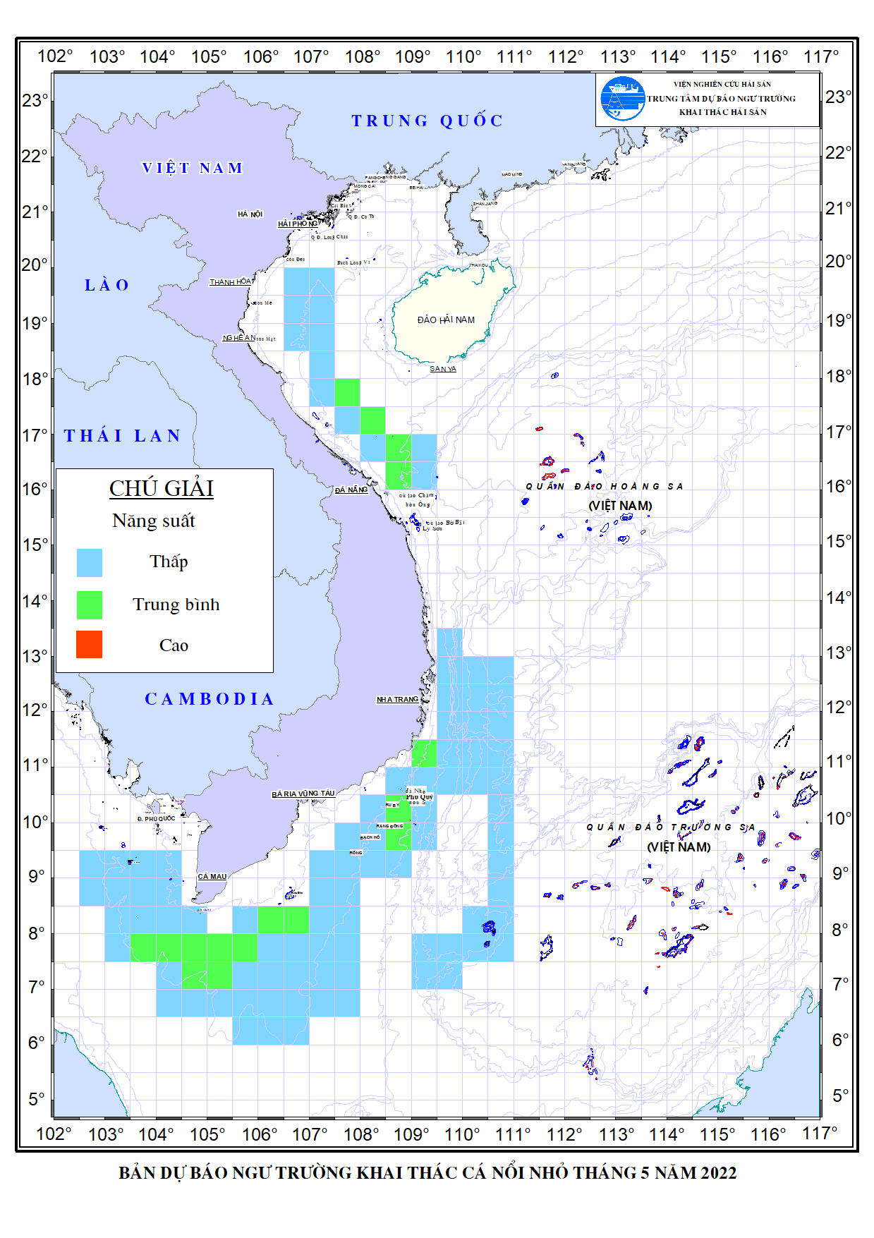 Trang nhất/ Dự báo khai thác theo đối tượng Dự báo ngư trường khai thác cá nổi nhỏ tháng 5/2022 Mùa vụ: Vụ Nam () | Năm dự báo: 2022 | Tháng dự báo: 05/2022 Đối tượng dự báo: Cá nổi nhỏ Cơ quan dự báo: Trung tâm Dự báo ngư trường Khai thác hải sản