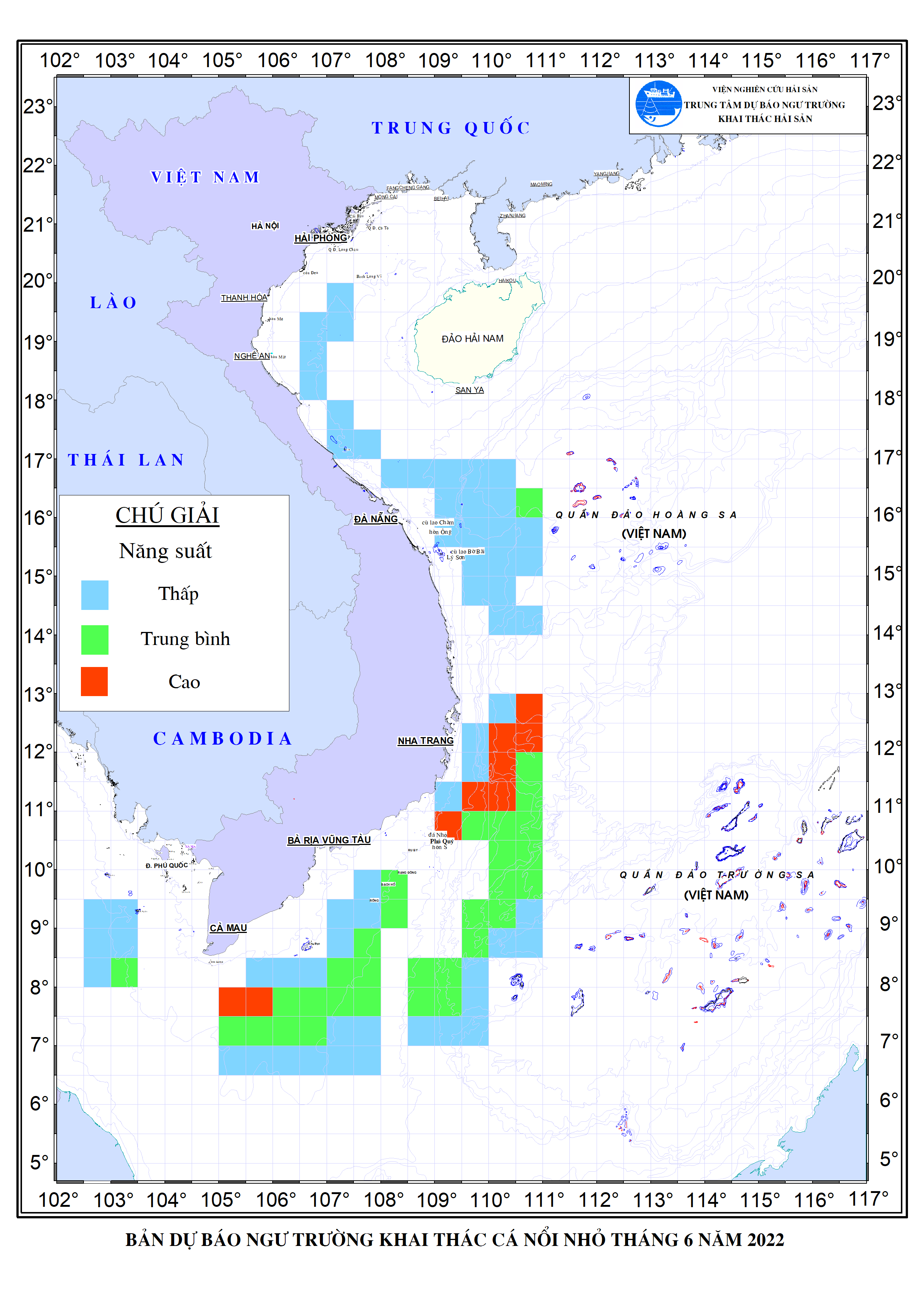 Trang nhất/ Dự báo khai thác theo đối tượng Dự báo ngư trường khai thác cá nổi nhỏ tháng 6/2022 Mùa vụ: Vụ Nam () | Năm dự báo: 2022 | Tháng dự báo: 06/2022 Đối tượng dự báo: Cá nổi nhỏ Cơ quan dự báo: Trung tâm Dự báo ngư trường Khai thác hải sản