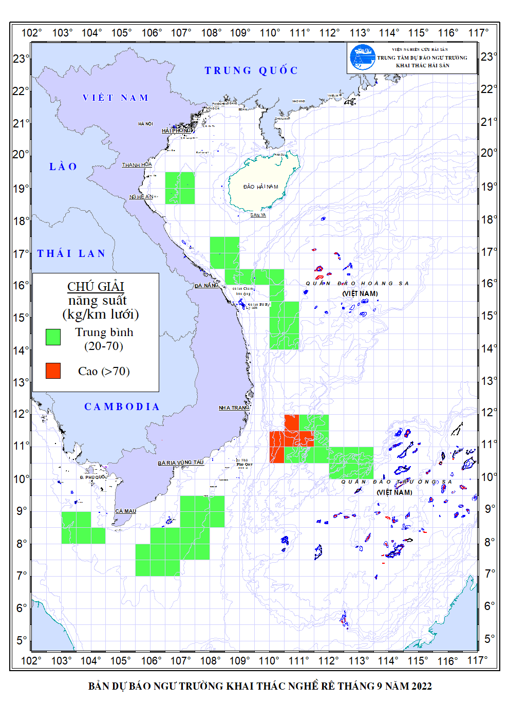 Trang nhất/ Dự báo khai thác theo nghề Dự báo ngư trường khai thác nghề lưới rê tháng 9/2022 Mùa vụ: Vụ Nam () | Năm dự báo: 2022 | Tháng dự báo: 09/2022 Nghề: Rê Cơ quan dự báo: Trung tâm Dự báo ngư trường Khai thác hải sản