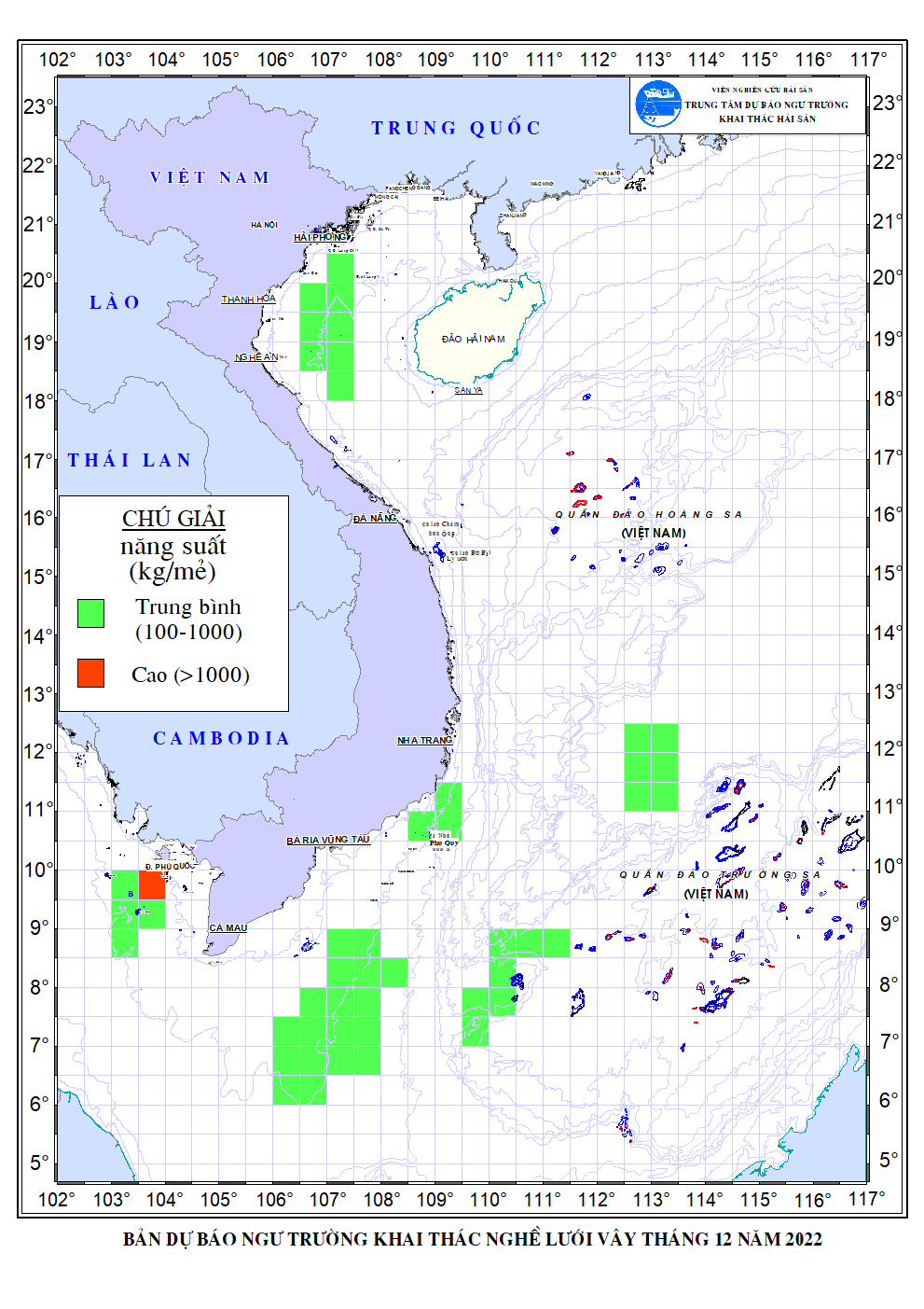 Trang nhất/ Dự báo khai thác theo nghề Dự báo ngư trường khai thác nghề lưới vây tháng 12/2022 Mùa vụ: Vụ Bắc () | Năm dự báo: 2022 | Tháng dự báo: 12/2022 Nghề: Vây Cơ quan dự báo: Trung tâm Dự báo ngư trường Khai thác hải sản