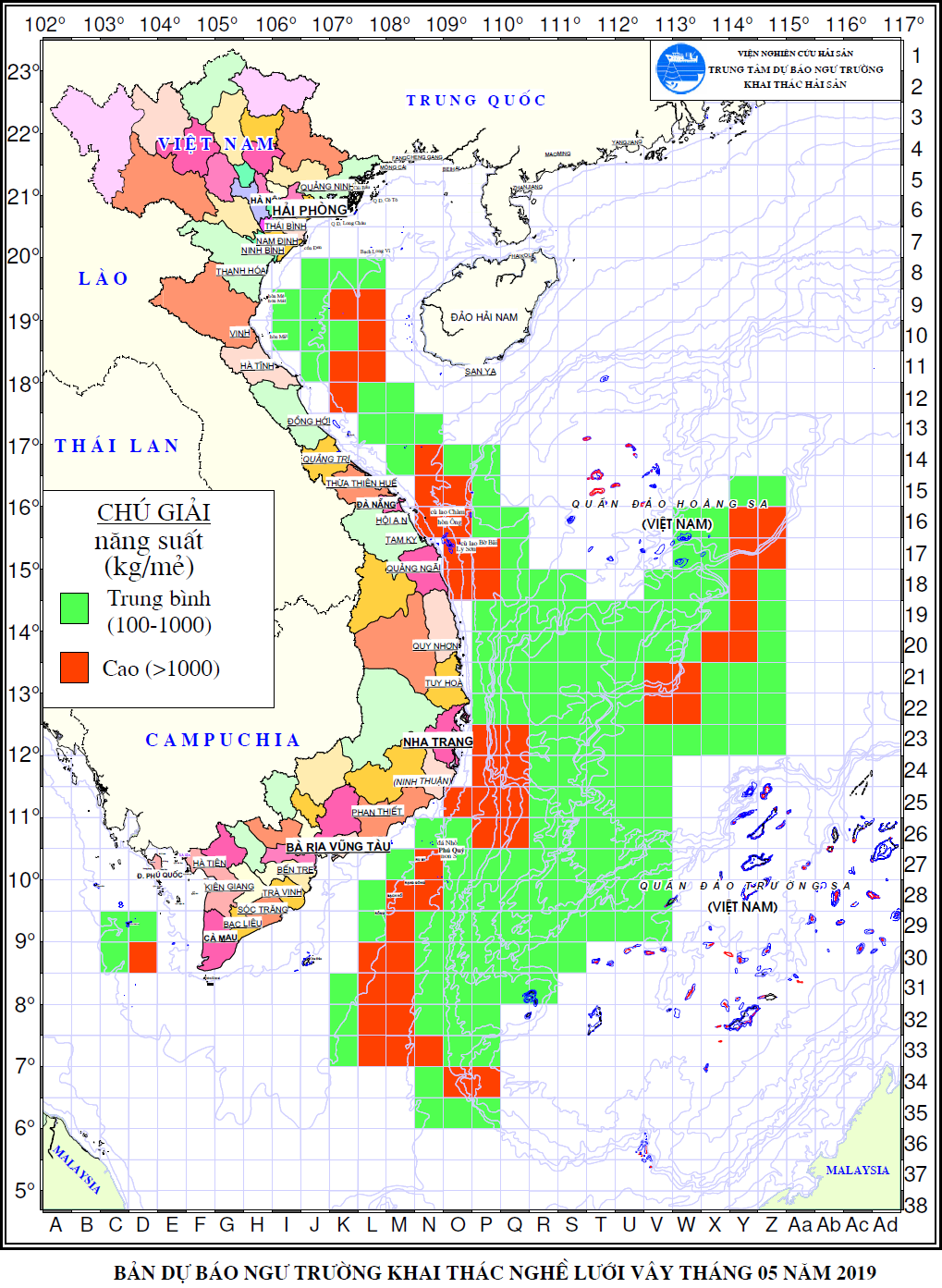 Trang nhất/ Dự báo khai thác theo nghề Dự báo ngư trường khai thác nghề vây Mùa vụ: Vụ Nam (DBNTKT thác nghề vây tháng 5/2019) | Năm dự báo: 2019 | Tháng dự báo: 05/2019 Nghề: Vây Cơ quan dự báo: Trung tâm Dự báo ngư trường Khai thác hải sản