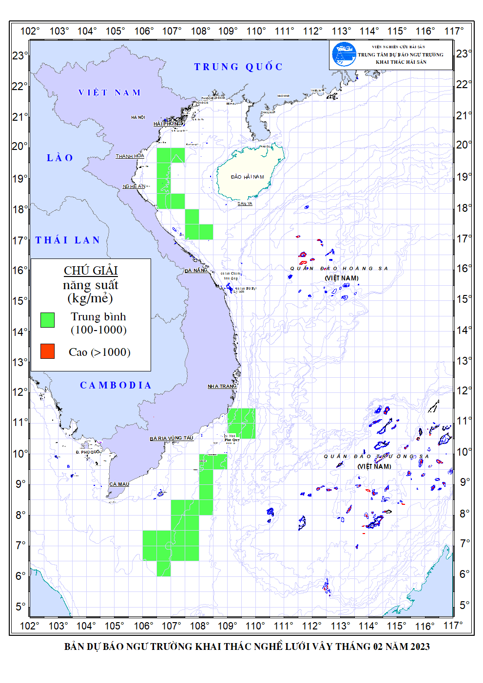 Trang nhất/ Dự báo khai thác theo nghề Dự báo ngư trường khai thác nghề vây tháng 02/2023 Mùa vụ: Vụ Bắc () | Năm dự báo: 2023 | Tháng dự báo: 02/2023 Nghề: Vây Cơ quan dự báo: Trung tâm Dự báo ngư trường Khai thác hải sản