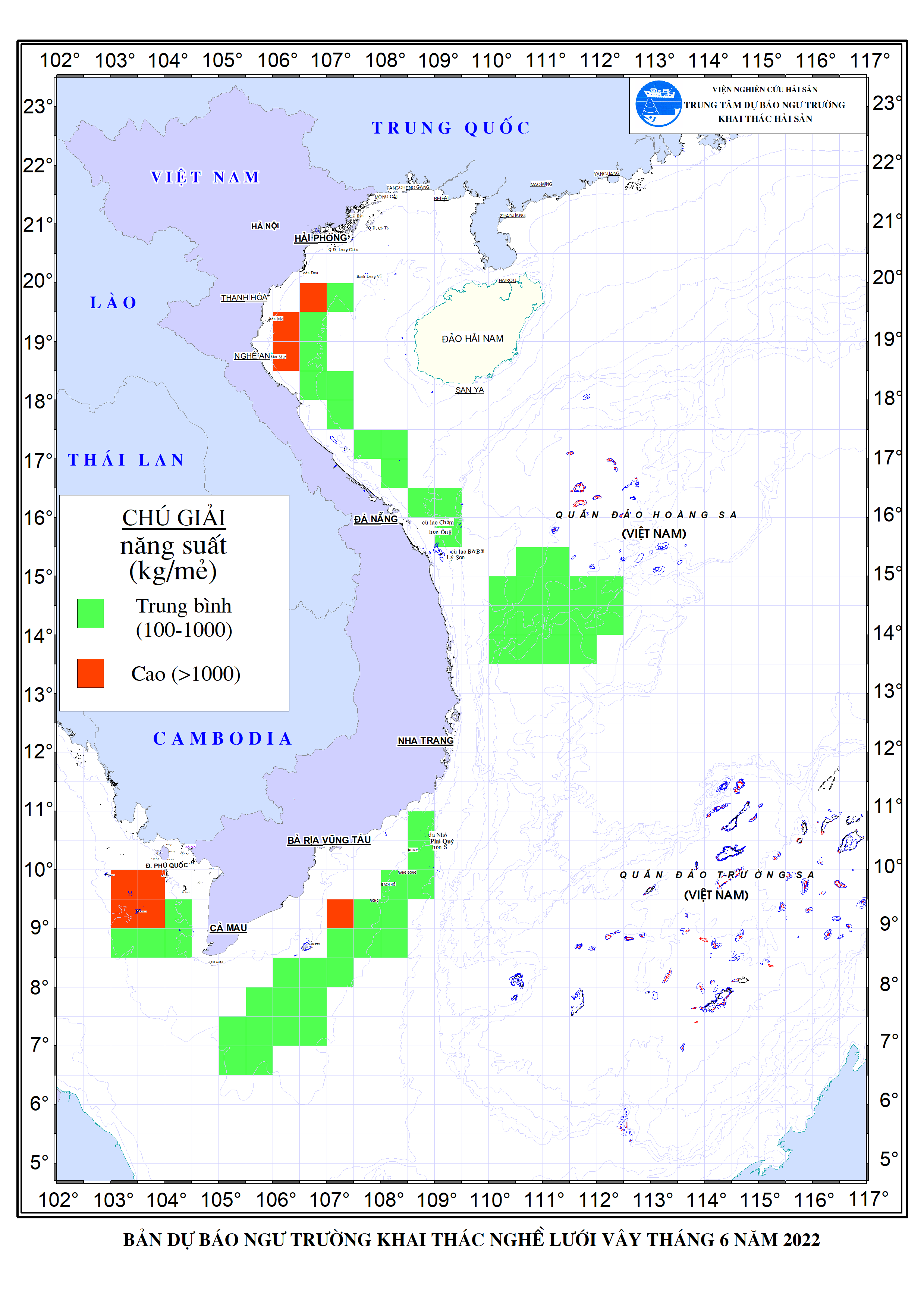 Trang nhất/ Dự báo khai thác theo nghề Dự báo ngư trường khai thác nghề vây tháng 6/2022 Mùa vụ: Vụ Nam () | Năm dự báo: 2022 | Tháng dự báo: 06/2022 Nghề: Vây Cơ quan dự báo: Trung tâm Dự báo ngư trường Khai thác hải sản