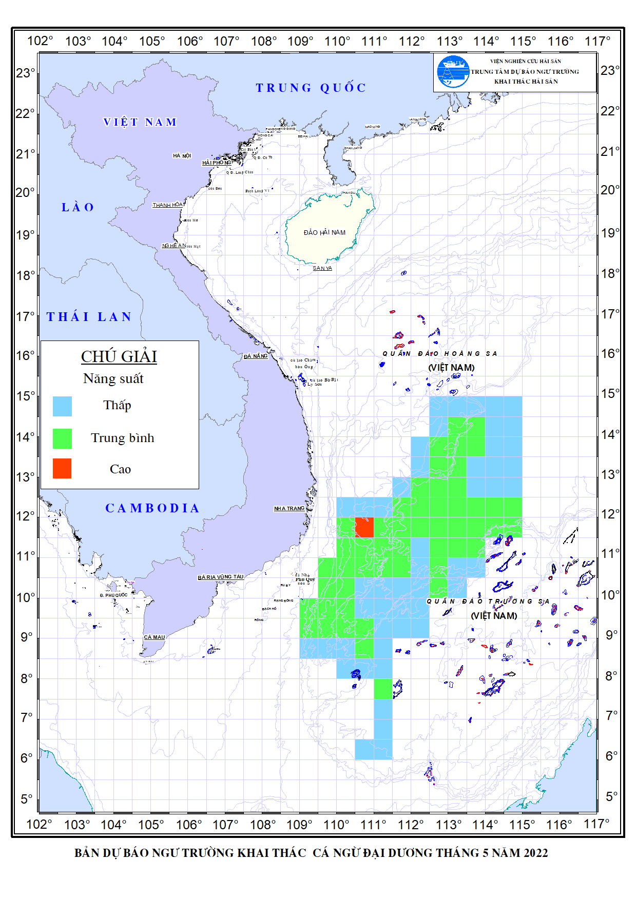 Trang nhất/ Dự báo khai thác theo nghề Dự báo ngư trường nghề câu cá ngừ đại dương tháng 5/2022 Mùa vụ: Vụ Nam () | Năm dự báo: 2022 | Tháng dự báo: 05/2022 Nghề: Câu cá ngừ đại dương Cơ quan dự báo: Trung tâm Dự báo ngư trường Khai thác hải sản