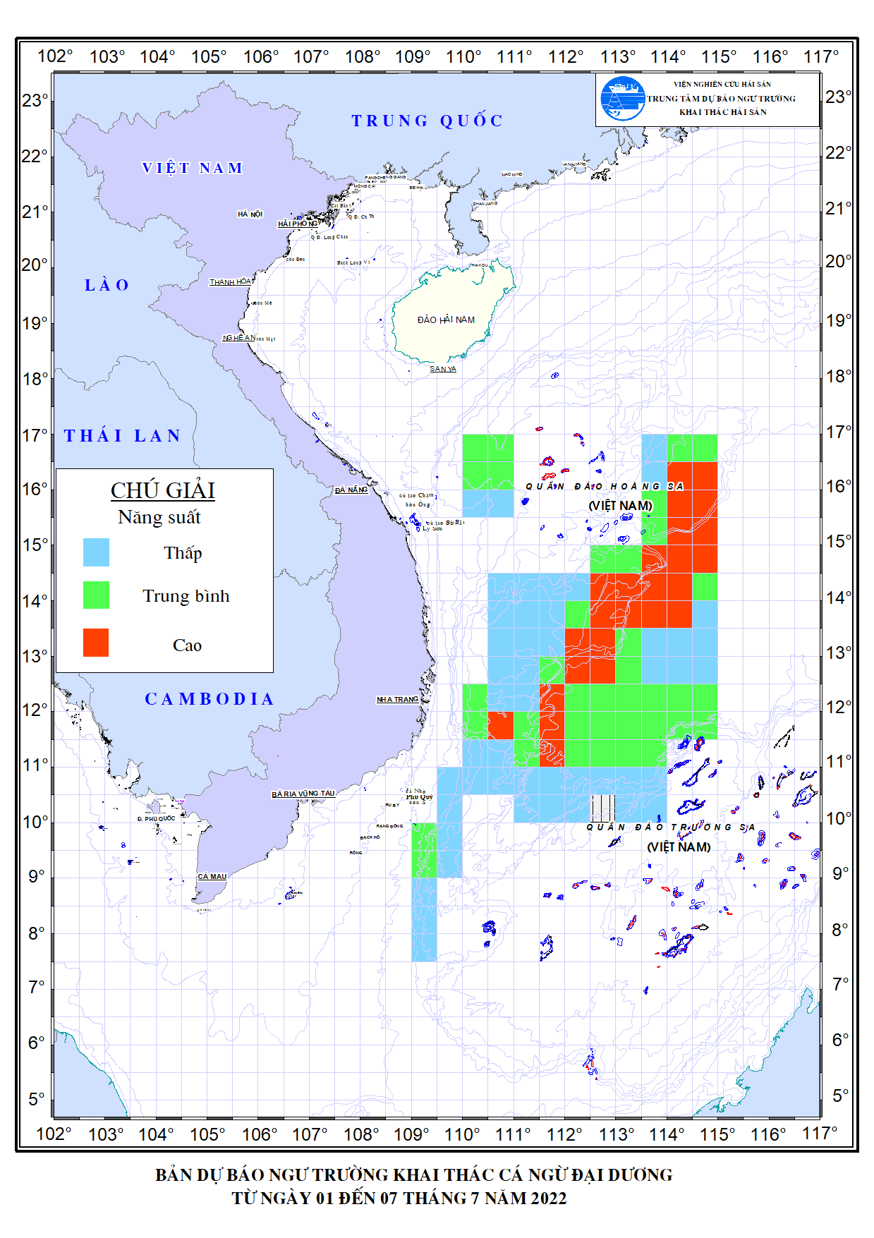 Trang nhất/ Dự báo khai thác theo nghề Dự báo ngư trường nghề câu cá ngừ đại dương từ 01-07/7/2022 Mùa vụ: Vụ Nam () | Năm dự báo: 2022 | Tháng dự báo: 07/2022 Nghề: Câu cá ngừ đại dương Cơ quan dự báo: Trung tâm Dự báo ngư trường Khai thác hải sản