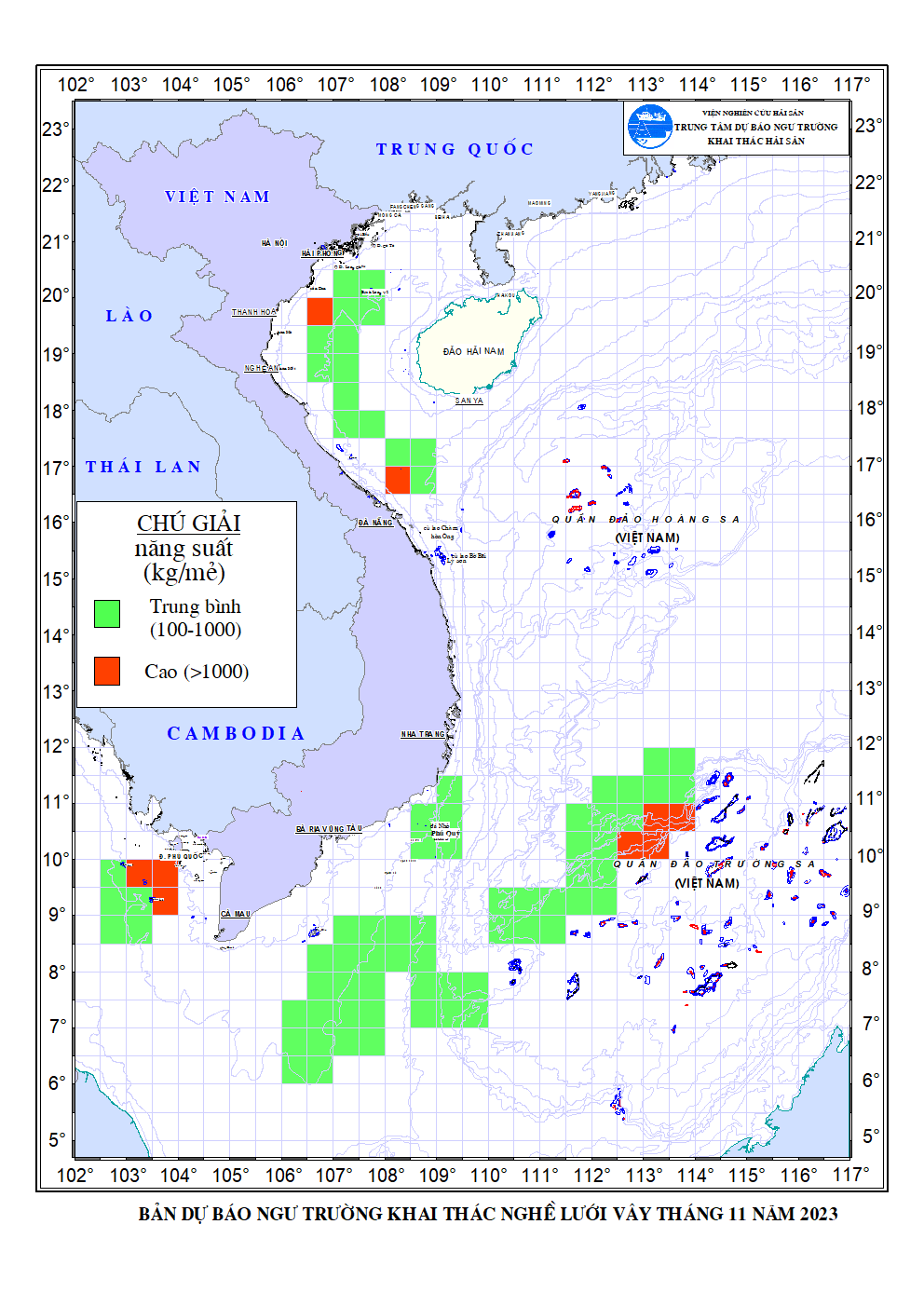 Trang nhất/ Dự báo khai thác theo nghề Dự báo ngư trường nghề lưới vây tháng 11/2023 Mùa vụ: Vụ Bắc () | Năm dự báo: 2023 | Tháng dự báo: 11/2023 Nghề: Vây Cơ quan dự báo: Trung tâm Dự báo ngư trường Khai thác hải sản