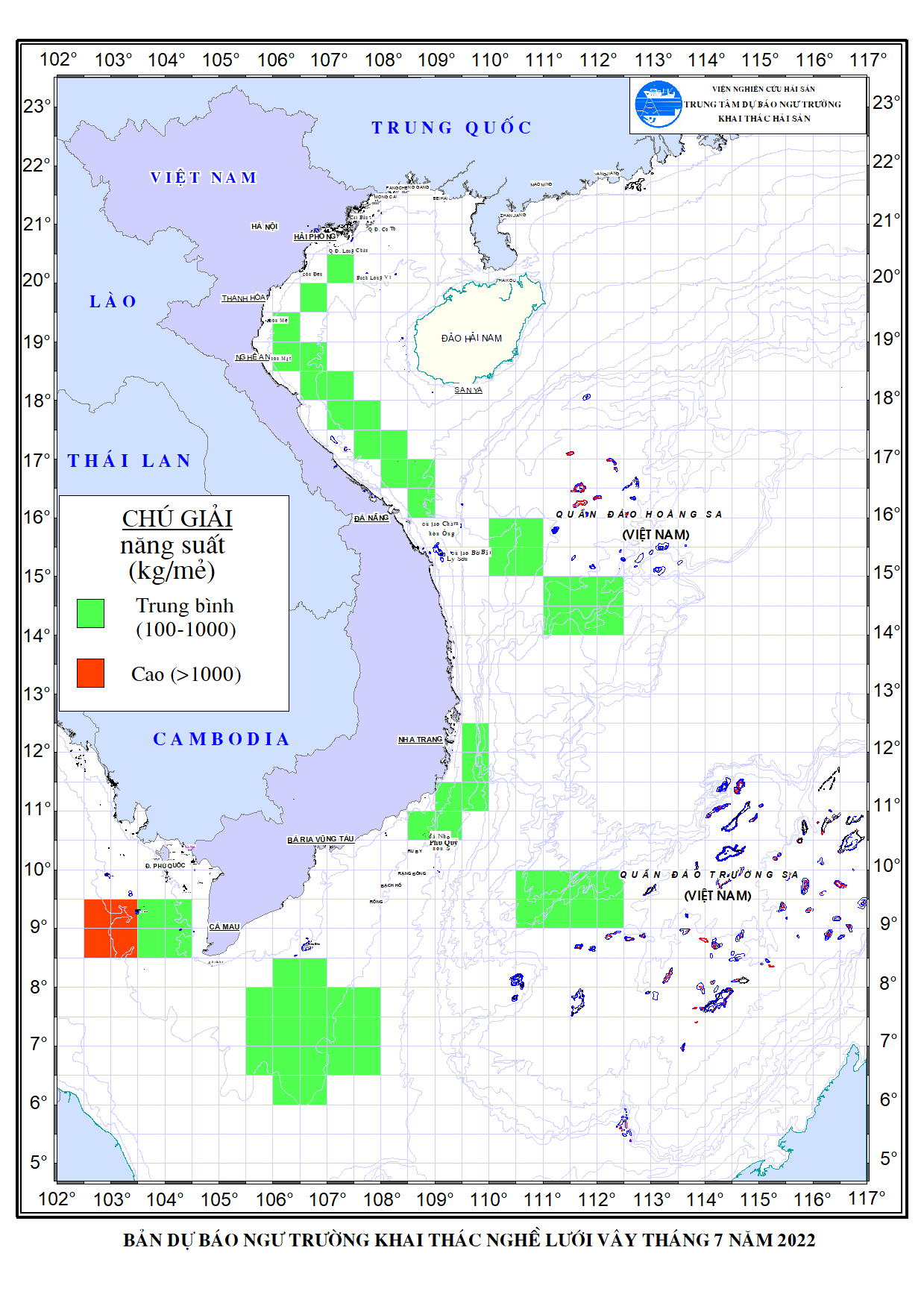 Trang nhất/ Dự báo khai thác theo nghề Dự báo ngư trường nghề lưới vây tháng 7/2022 Mùa vụ: Vụ Nam () | Năm dự báo: 2022 | Tháng dự báo: 07/2022 Nghề: Vây Cơ quan dự báo: Trung tâm Dự báo ngư trường Khai thác hải sản