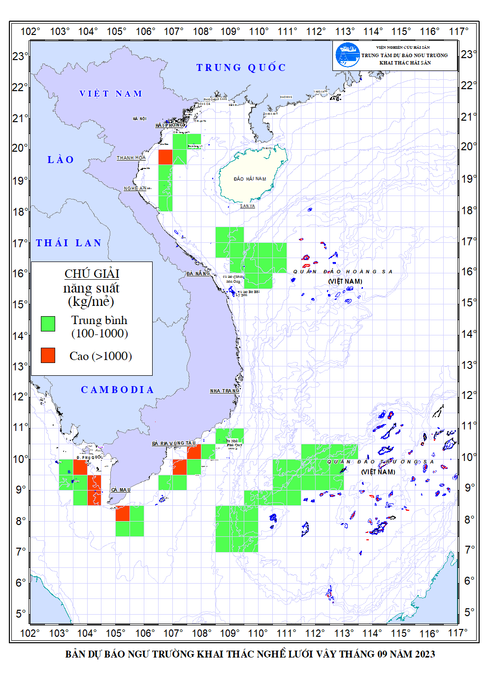 Trang nhất/ Dự báo khai thác theo nghề Dự báo ngư trường nghề lưới vây tháng 9/2023 Mùa vụ: Vụ Nam () | Năm dự báo: 2023 | Tháng dự báo: 09/2023 Nghề: Vây Cơ quan dự báo: Trung tâm Dự báo ngư trường Khai thác hải sản