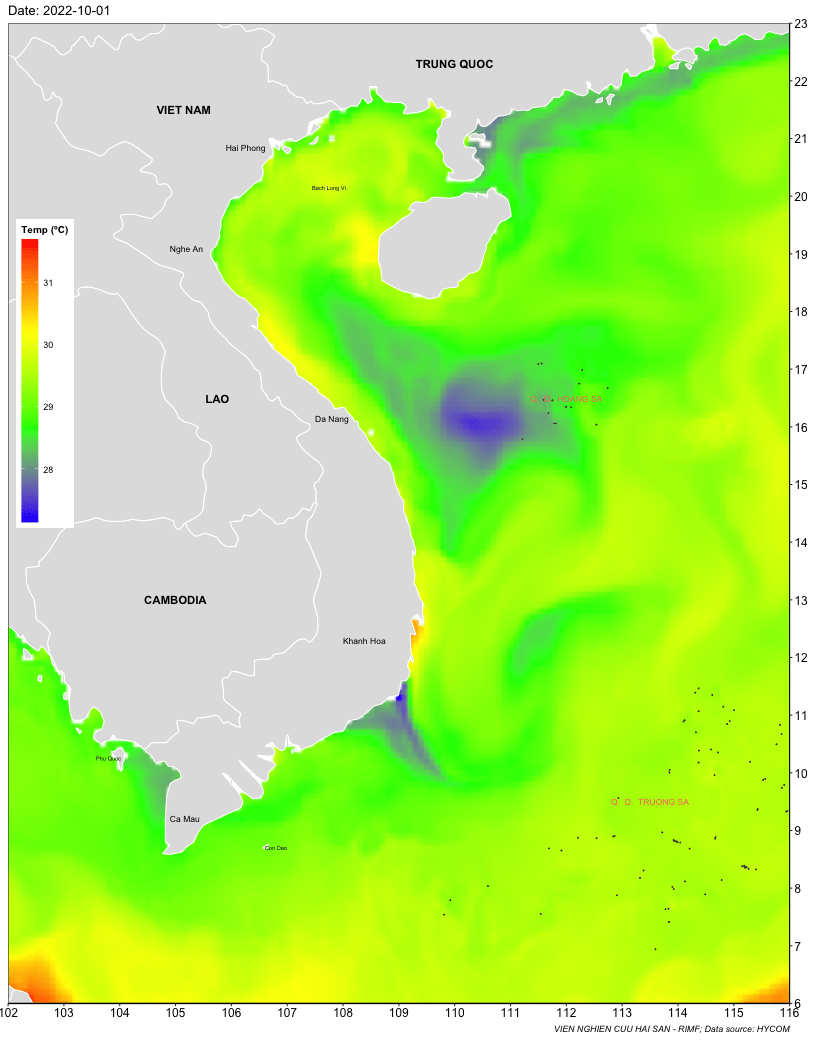 Trang nhất/ Dự báo khai thác theo đối tượng Dự báo nhiệt độ nước biển tầng mặt từ 01-07/10/2022 Mùa vụ: Vụ Bắc () | Năm dự báo: 2022 | Tháng dự báo: 10/2022 Đối tượng dự báo: Trường nhiệt độ nước biển mặt Cơ quan dự báo: Trung tâm Dự báo ngư trường Khai thác hải sản