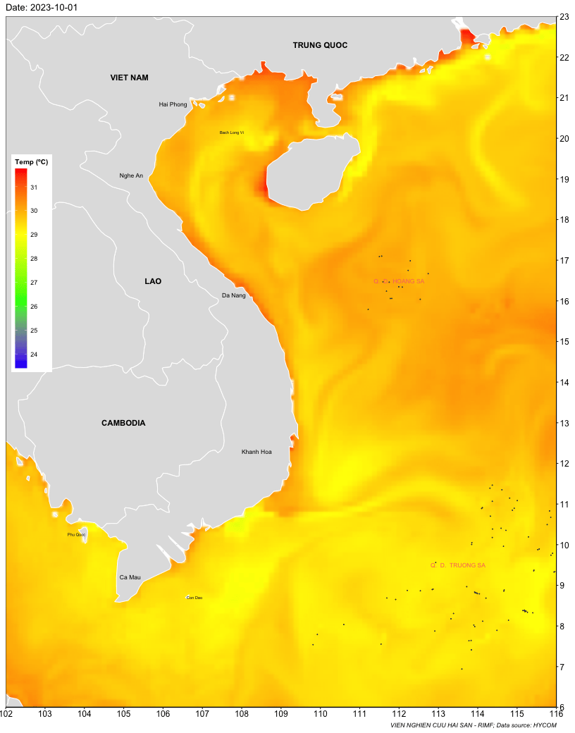 Trang nhất/ Dự báo khai thác theo đối tượng Dự báo nhiệt độ nước biển tầng mặt từ 01-07/10/2023 Mùa vụ: Vụ Bắc () | Năm dự báo: 2023 | Tháng dự báo: 10/2023 Đối tượng dự báo: Trường nhiệt độ nước biển mặt Cơ quan dự báo: Trung tâm Dự báo ngư trường Khai thác hải sản