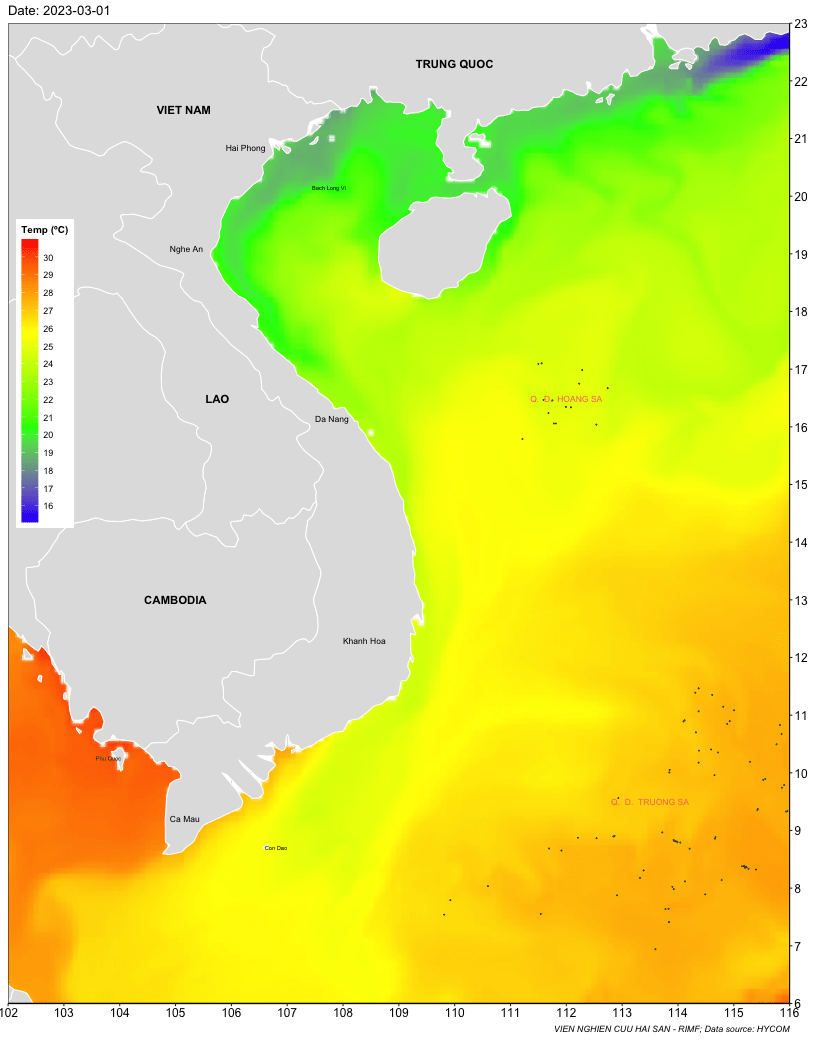 Trang nhất/ Dự báo khai thác theo đối tượng Dự báo nhiệt độ nước biển tầng mặt từ 01-07/3/2023 Mùa vụ: Vụ Bắc () | Năm dự báo: 2023 | Tháng dự báo: 03/2023 Đối tượng dự báo: Trường nhiệt độ nước biển mặt Cơ quan dự báo: Trung tâm Dự báo ngư trường Khai thác hải sản