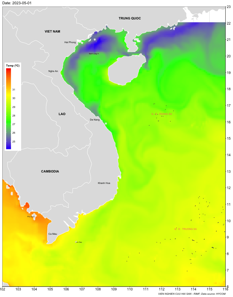 Trang nhất/ Dự báo khai thác theo đối tượng Dự báo nhiệt độ nước biển tầng mặt từ 01-07/5/2023 Mùa vụ: Vụ Nam () | Năm dự báo: 2023 | Tháng dự báo: 05/2023 Đối tượng dự báo: Trường nhiệt độ nước biển mặt Cơ quan dự báo: Trung tâm Dự báo ngư trường Khai thác hải sản