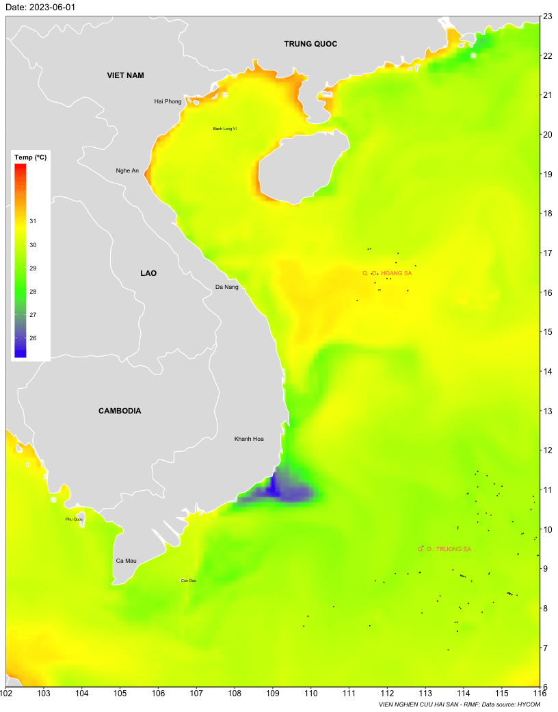 Trang nhất/ Dự báo khai thác theo đối tượng Dự báo nhiệt độ nước biển tầng mặt từ 01-07/6/2023 Mùa vụ: Vụ Nam () | Năm dự báo: 2023 | Tháng dự báo: 06/2023 Đối tượng dự báo: Trường nhiệt độ nước biển mặt Cơ quan dự báo: Trung tâm Dự báo ngư trường Khai thác hải sản