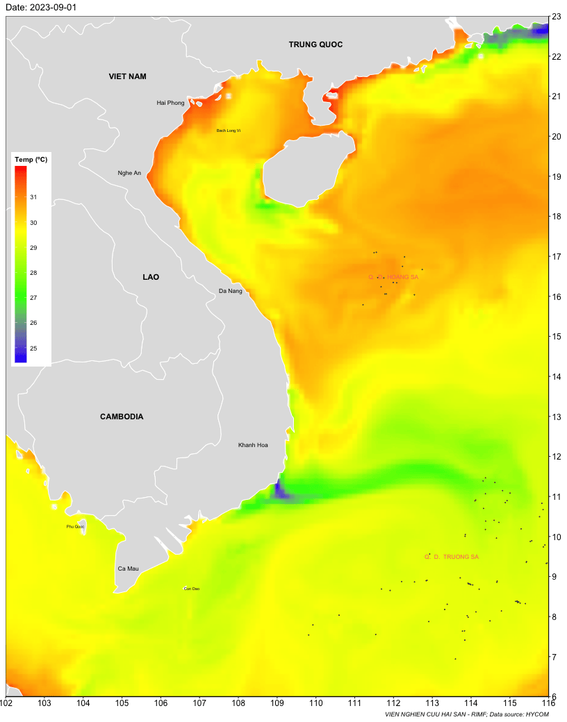 Trang nhất/ Dự báo khai thác theo đối tượng Dự báo nhiệt độ nước biển tầng mặt từ 01 - 07/9/2023 Mùa vụ: Vụ Nam () | Năm dự báo: 2023 | Tháng dự báo: 09/2023 Đối tượng dự báo: Trường nhiệt độ nước biển mặt Cơ quan dự báo: Trung tâm Dự báo ngư trường Khai thác hải sản