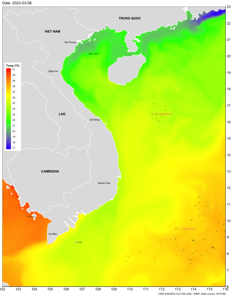 Trang nhất/ Dự báo khai thác theo đối tượng Dự báo nhiệt độ nước biển tầng mặt từ 08-15/3/2023 Mùa vụ: Vụ Bắc () | Năm dự báo: 2023 | Tháng dự báo: 03/2023 Đối tượng dự báo: Trường nhiệt độ nước biển mặt Cơ quan dự báo: Trung tâm Dự báo ngư trường Khai thác hải sản