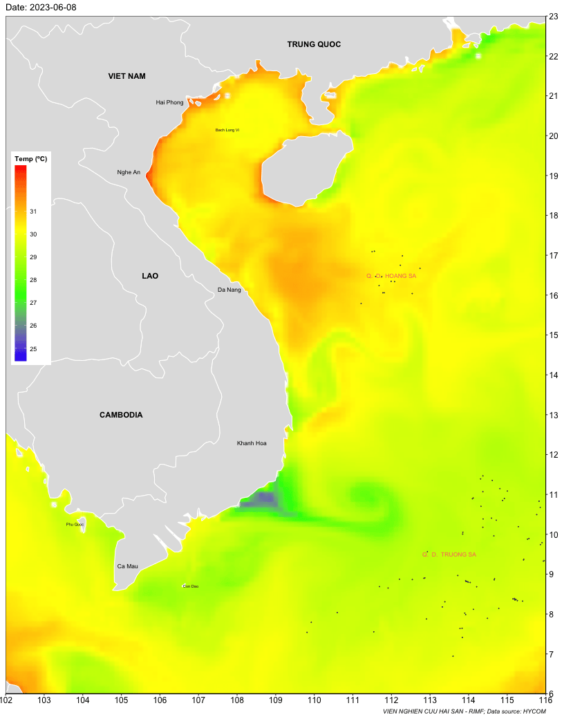 Trang nhất/ Dự báo khai thác theo đối tượng Dự báo nhiệt độ nước biển tầng mặt từ 08-15/6/2023 Mùa vụ: Vụ Nam () | Năm dự báo: 2023 | Tháng dự báo: 06/2023 Đối tượng dự báo: Trường nhiệt độ nước biển mặt Cơ quan dự báo: Trung tâm Dự báo ngư trường Khai thác hải sản