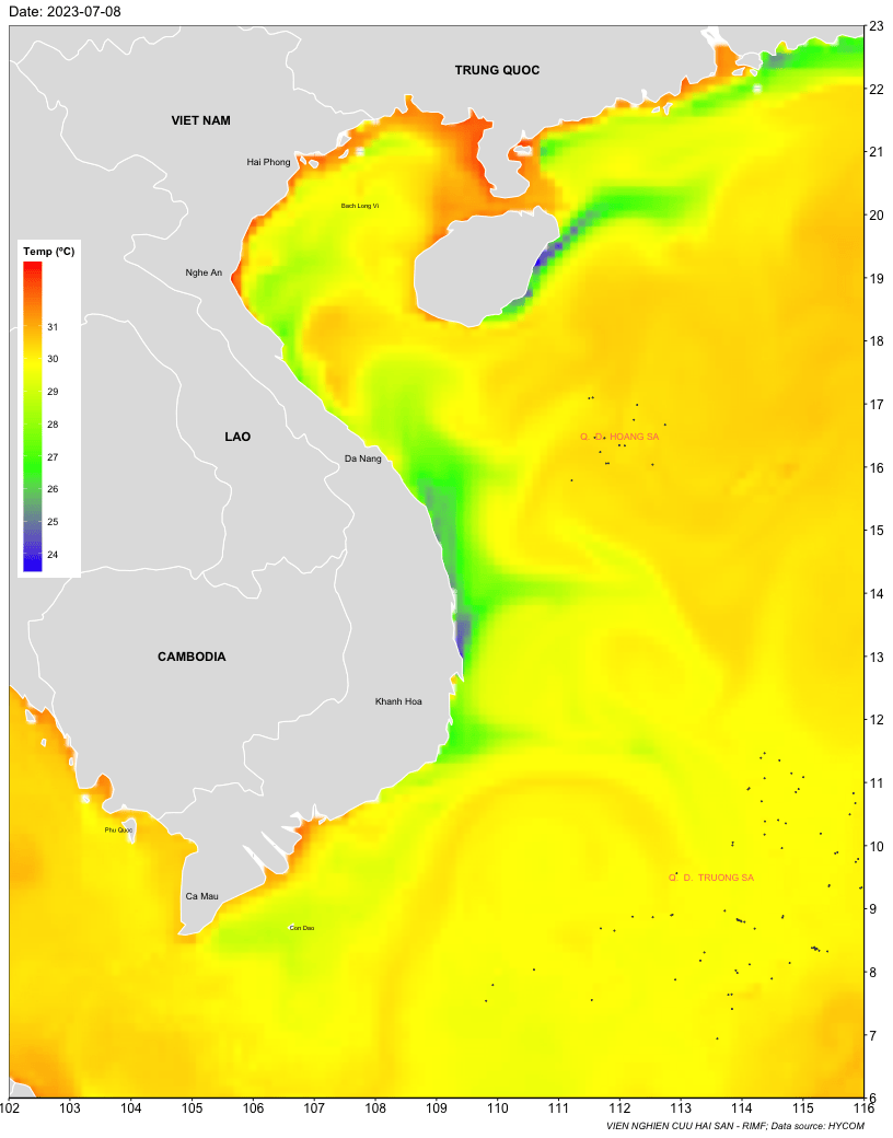 Trang nhất/ Dự báo khai thác theo đối tượng Dự báo nhiệt độ nước biển tầng mặt từ 08-15/7/2023 Mùa vụ: Vụ Nam () | Năm dự báo: 2023 | Tháng dự báo: 07/2023 Đối tượng dự báo: Trường nhiệt độ nước biển mặt Cơ quan dự báo: Trung tâm Dự báo ngư trường Khai thác hải sản