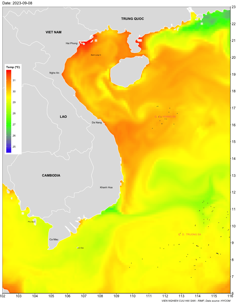 Trang nhất/ Dự báo khai thác theo đối tượng Dự báo nhiệt độ nước biển tầng mặt từ 08-15/9/2023 Mùa vụ: Vụ Nam () | Năm dự báo: 2023 | Tháng dự báo: 09/2023 Đối tượng dự báo: Trường nhiệt độ nước biển mặt Cơ quan dự báo: Trung tâm Dự báo ngư trường Khai thác hải sản