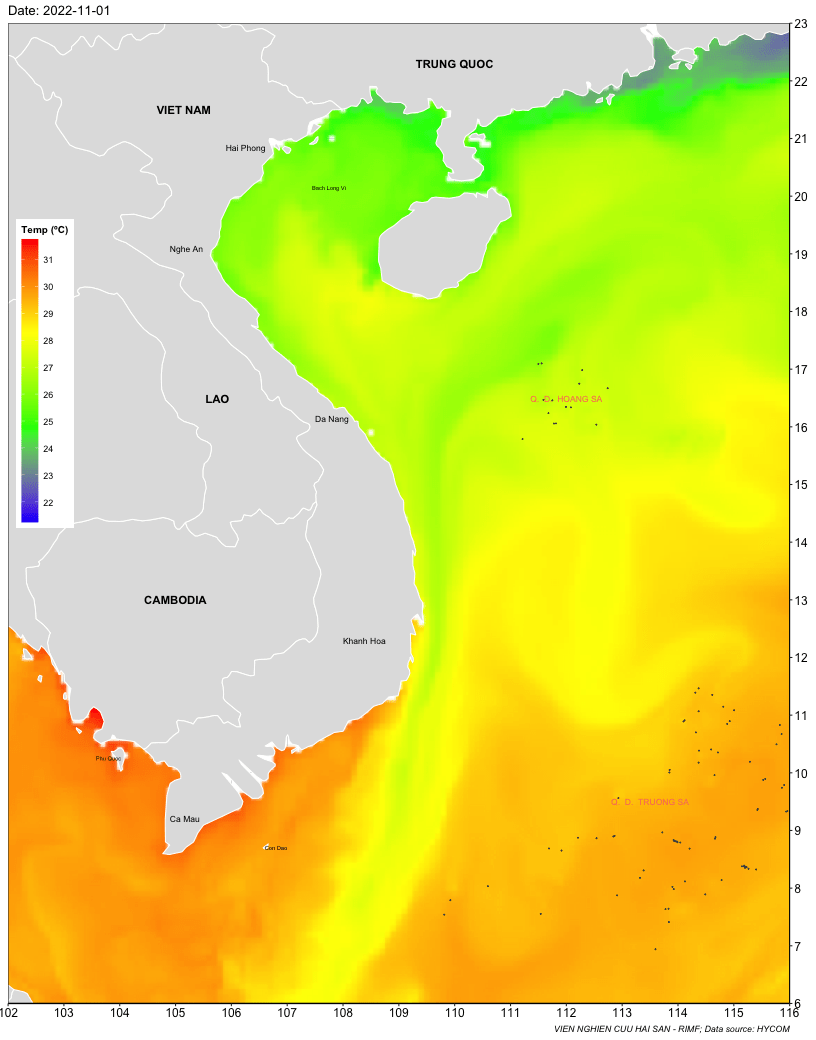 Trang nhất/ Dự báo khai thác theo đối tượng Dự báo nhiệt độ nước biển tầng mặt từ 1-7/11/2022 Mùa vụ: Vụ Bắc () | Năm dự báo: 2022 | Tháng dự báo: 11/2022 Đối tượng dự báo: Trường nhiệt độ nước biển mặt Cơ quan dự báo: Trung tâm Dự báo ngư trường Khai thác hải sản