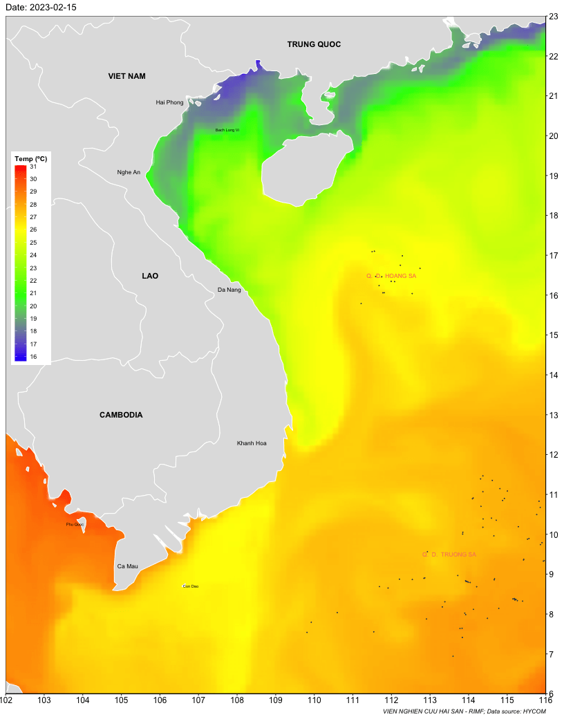 Trang nhất/ Dự báo khai thác theo đối tượng Dự báo nhiệt độ nước biển tầng mặt từ 16-23/2/2023 Mùa vụ: Vụ Nam () | Năm dự báo: 2023 | Tháng dự báo: 02/2023 Đối tượng dự báo: Trường nhiệt độ nước biển mặt Cơ quan dự báo: Trung tâm Dự báo ngư trường Khai thác hải sản