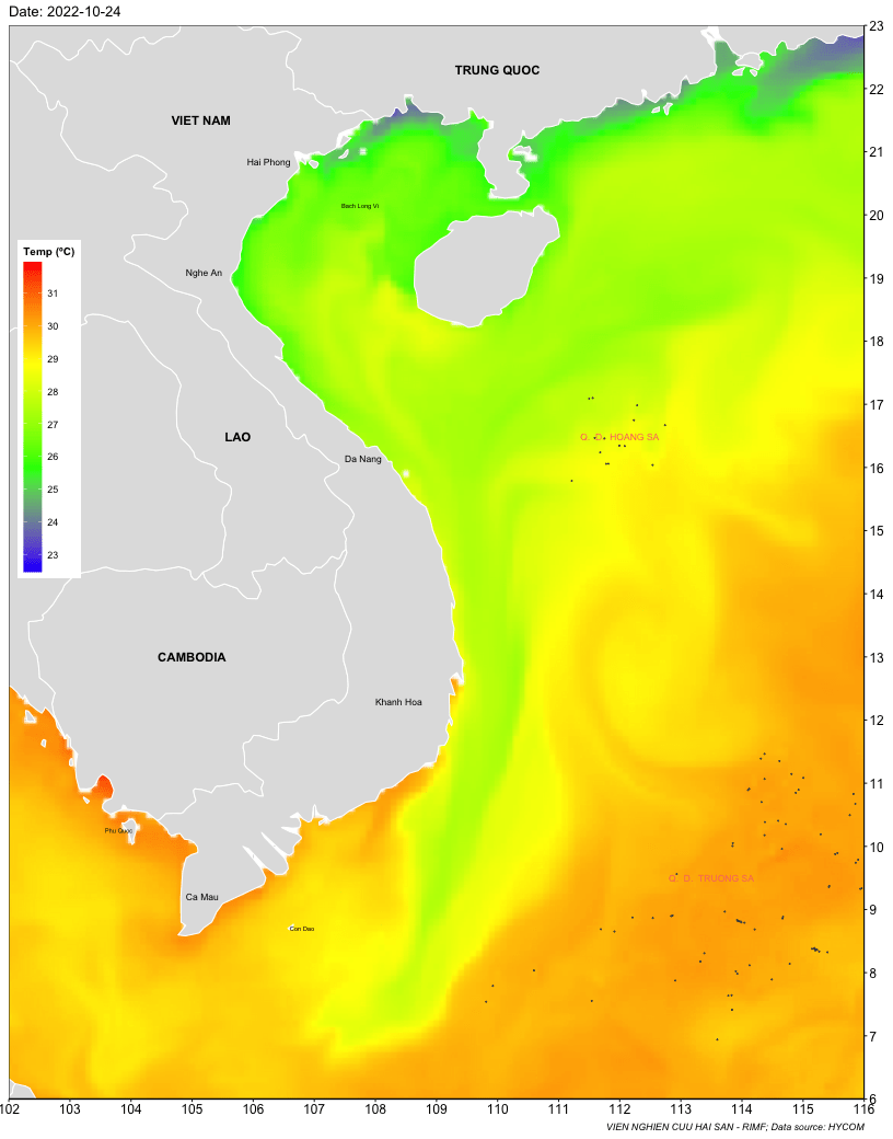Trang nhất/ Dự báo khai thác theo đối tượng Dự báo nhiệt độ nước biển tầng mặt từ 24-31/10/2022 Mùa vụ: Vụ Bắc () | Năm dự báo: 2022 | Tháng dự báo: 10/2022 Đối tượng dự báo: Trường nhiệt độ nước biển mặt Cơ quan dự báo: Trung tâm Dự báo ngư trường Khai thác hải sản