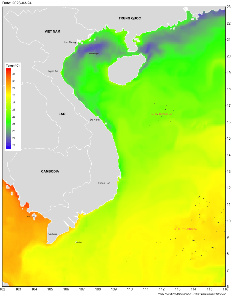Trang nhất/ Dự báo khai thác theo đối tượng Dự báo nhiệt độ nước biển tầng mặt từ 24-31/3/2023 Mùa vụ: Vụ Bắc () | Năm dự báo: 2023 | Tháng dự báo: 03/2023 Đối tượng dự báo: Trường nhiệt độ nước biển mặt Cơ quan dự báo: Trung tâm Dự báo ngư trường Khai thác hải sản