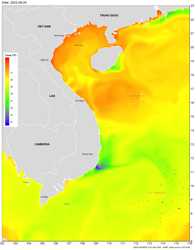 Trang nhất/ Dự báo khai thác theo đối tượng Dự báo nhiệt độ nước biển tầng mặt từ 24-31/8/2023 Mùa vụ: Vụ Nam () | Năm dự báo: 2023 | Tháng dự báo: 08/2023 Đối tượng dự báo: Trường nhiệt độ nước biển mặt Cơ quan dự báo: Trung tâm Dự báo ngư trường Khai thác hải sản