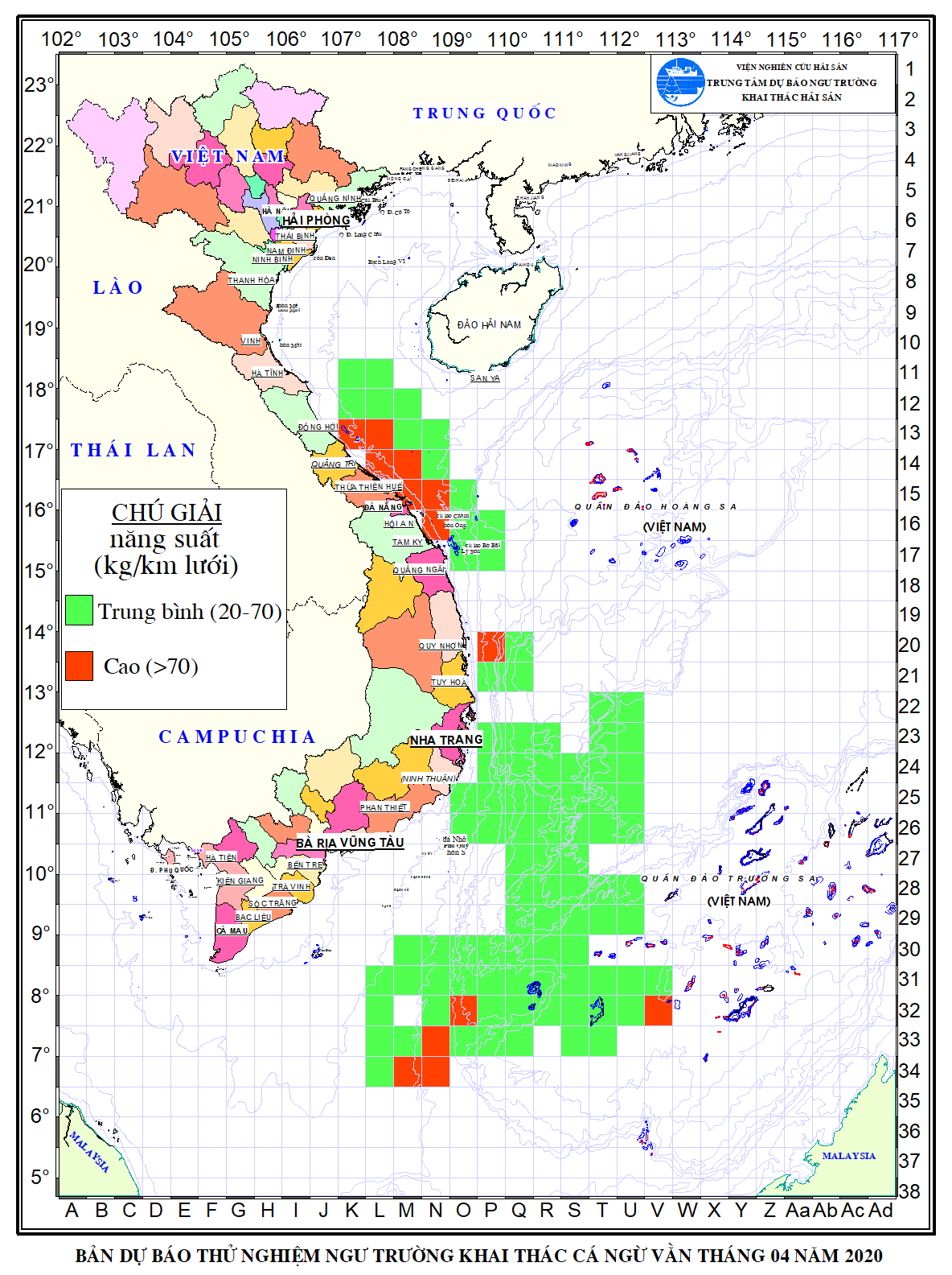 Trang nhất/ Dự báo khai thác theo đối tượng Dự báo NTKT Cá ngừ vằn tháng 04/2020 Mùa vụ: Vụ Nam (Dự báo NTKT Cá ngừ vằn tháng 04/2020) | Năm dự báo: 2020 | Tháng dự báo: 04/2020 Đối tượng dự báo: Cá ngừ vằn Cơ quan dự báo: Trung tâm Dự báo ngư trường Khai thác hải sản