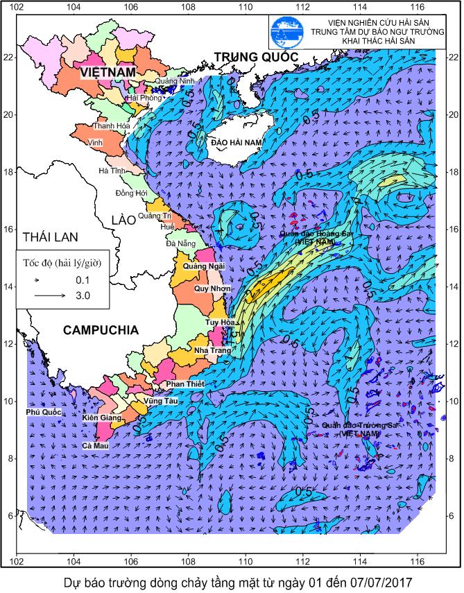 Trang nhất/ Dự báo khai thác theo đối tượng Dự báo trường dòng chảy tầng mặt từ 01-07/7/2017 Mùa vụ: Vụ Nam (BD trường dòng chảy tầng mặt từ 01-07/7/2017) | Năm dự báo: 2017 | Tháng dự báo: 07/2017 Đối tượng dự báo: Trường dòng chảy tầng mặt Cơ quan dự báo: Trung tâm Dự báo ngư trường Khai thác hải sản