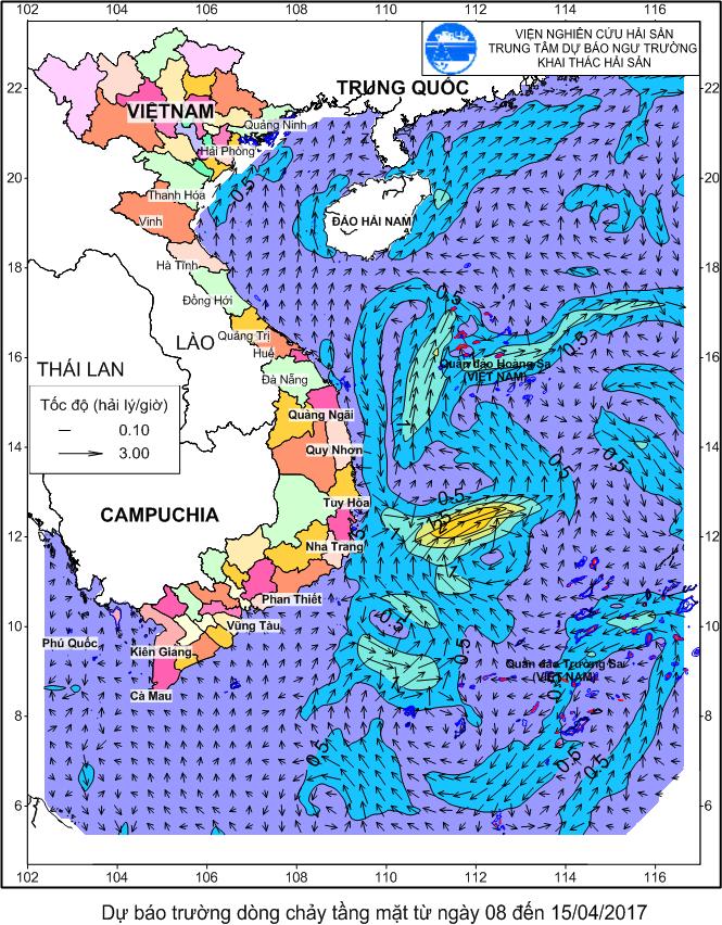 Trang nhất/ Dự báo khai thác theo đối tượng Dự báo trường dòng chảy tầng mặt từ 08-15/4/2017 Mùa vụ: Vụ Nam (DB trường dòng chảy tầng mặt từ 08-15/4/2017) | Năm dự báo: 2017 | Tháng dự báo: 04/2017 Đối tượng dự báo: Khác Cơ quan dự báo: Trung tâm Dự báo ngư trường Khai thác hải sản