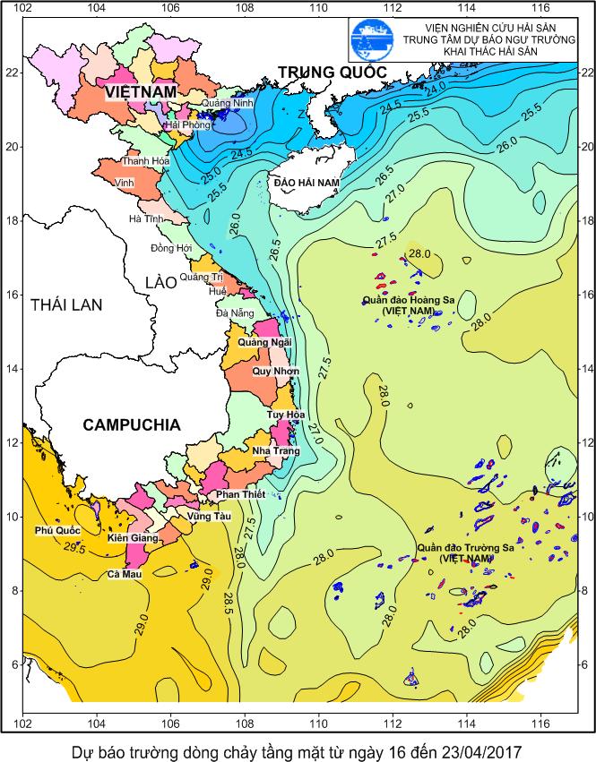 Trang nhất/ Dự báo khai thác theo đối tượng Dự báo trường dòng chảy tầng mặt từ 16-23/4/2017 Mùa vụ: Vụ Nam (DB trường dòng chảy tầng mặt từ 16-23/4/2017) | Năm dự báo: 2017 | Tháng dự báo: 04/2017 Đối tượng dự báo: Trường dòng chảy tầng mặt Cơ quan dự báo: Trung tâm Dự báo ngư trường Khai thác hải sản