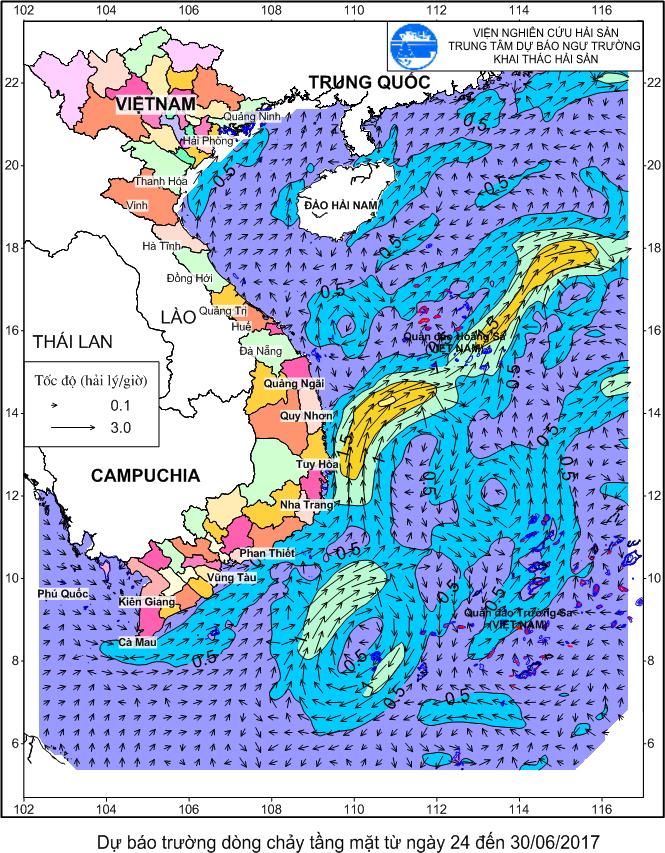 Trang nhất/ Dự báo khai thác theo đối tượng Dự báo trường dòng chảy tầng mặt từ 24-30/6/2017 Mùa vụ: Vụ Nam (Dự báo trường dòng chảy tầng mặt từ 24-30/6/2017) | Năm dự báo: 2017 | Tháng dự báo: 06/2017 Đối tượng dự báo: Trường dòng chảy tầng mặt Cơ quan dự báo: Trung tâm Dự báo ngư trường Khai thác hải sản