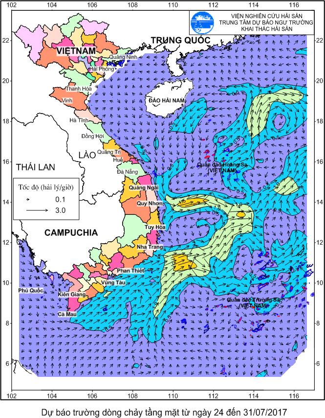 Trang nhất/ Dự báo khai thác theo đối tượng Dự báo trường dòng chảy tầng mặt từ 24-31/7/2017 Mùa vụ: Vụ Nam (DB trường dòng chảy tầng mặt từ 24-31/7/2017) | Năm dự báo: 2017 | Tháng dự báo: 07/2017 Đối tượng dự báo: Trường dòng chảy tầng mặt Cơ quan dự báo: Trung tâm Dự báo ngư trường Khai thác hải sản