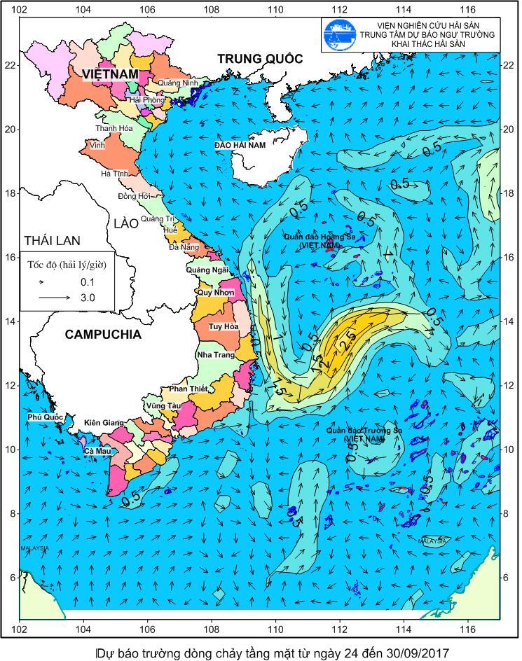 Trang nhất/ Dự báo khai thác theo đối tượng Dự báo trường dòng chảy tầng mặt từ ngày 24-30/9/2017 Mùa vụ: Vụ Nam (DB trường dòng chảy tầng mặt từ ngày 24-30/9/2017) | Năm dự báo: 2017 | Tháng dự báo: 09/2017 Đối tượng dự báo: Trường dòng chảy tầng mặt Cơ quan dự báo: Trung tâm Dự báo ngư trường Khai thác hải sản
