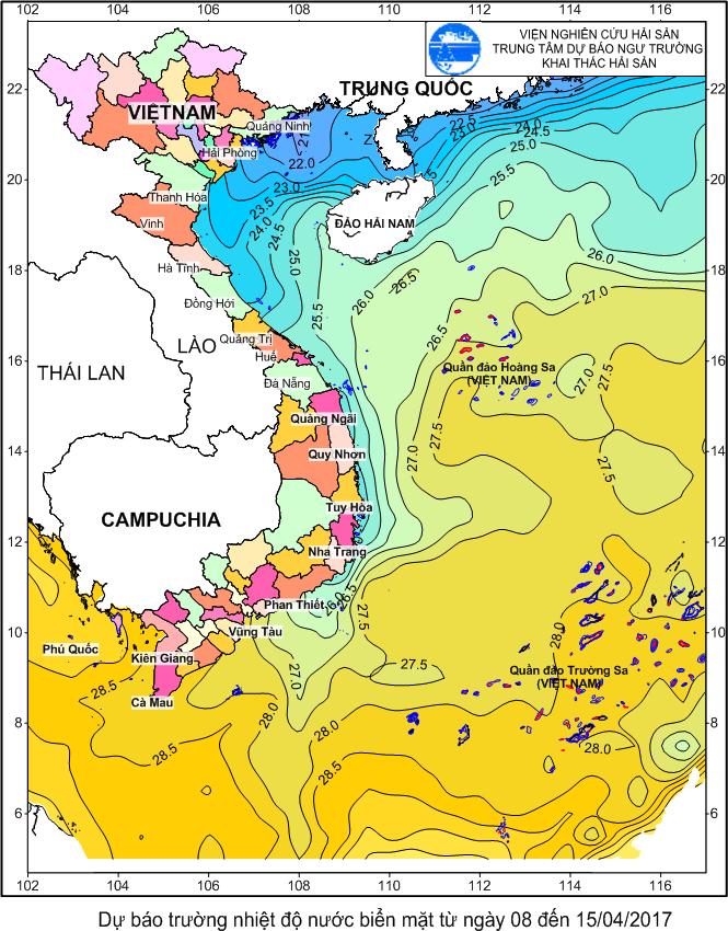 Trang nhất/ Dự báo khai thác theo đối tượng Dự báo trường nhiệt độ mặt nước biển từ 08-15/4/2017 Mùa vụ: Vụ Nam (DB trường nhiệt độ mặt nước biển từ 08-15/4/2017) | Năm dự báo: 2017 | Tháng dự báo: 04/2017 Đối tượng dự báo: Khác Cơ quan dự báo: Trung tâm Dự báo ngư trường Khai thác hải sản