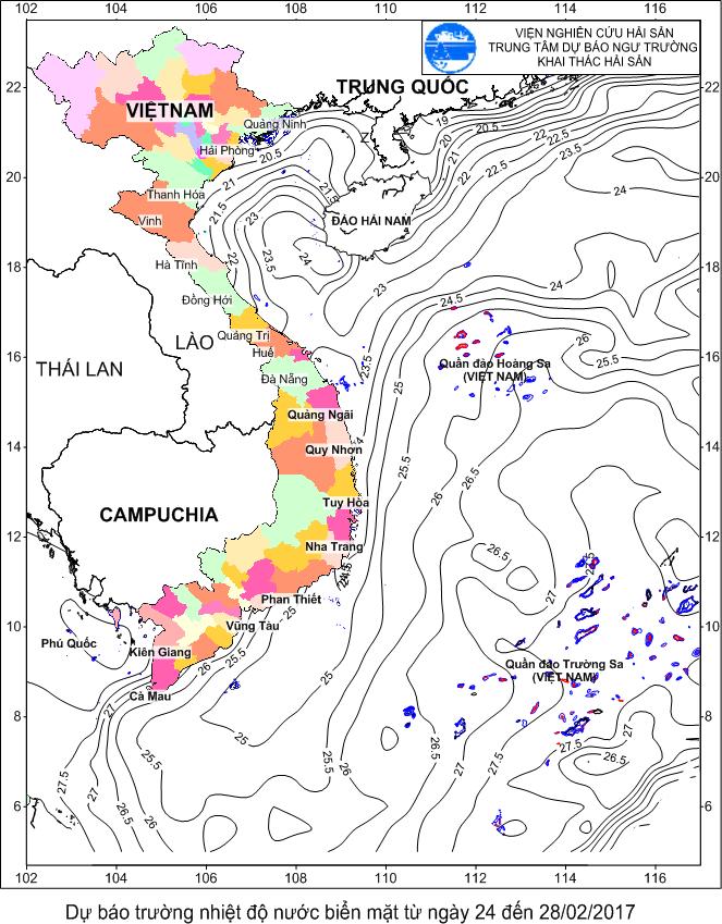 Trang nhất/ Dự báo khai thác theo đối tượng Dự báo trường nhiệt độ mặt nước biển từ 24-28/2/2017 Mùa vụ: Vụ Nam (DB trường nhiệt độ mặt nước biển từ 24-28/2/2017) | Năm dự báo: 2017 | Tháng dự báo: 02/2017 Đối tượng dự báo: Khác Cơ quan dự báo: Trung tâm Dự báo ngư trường Khai thác hải sản